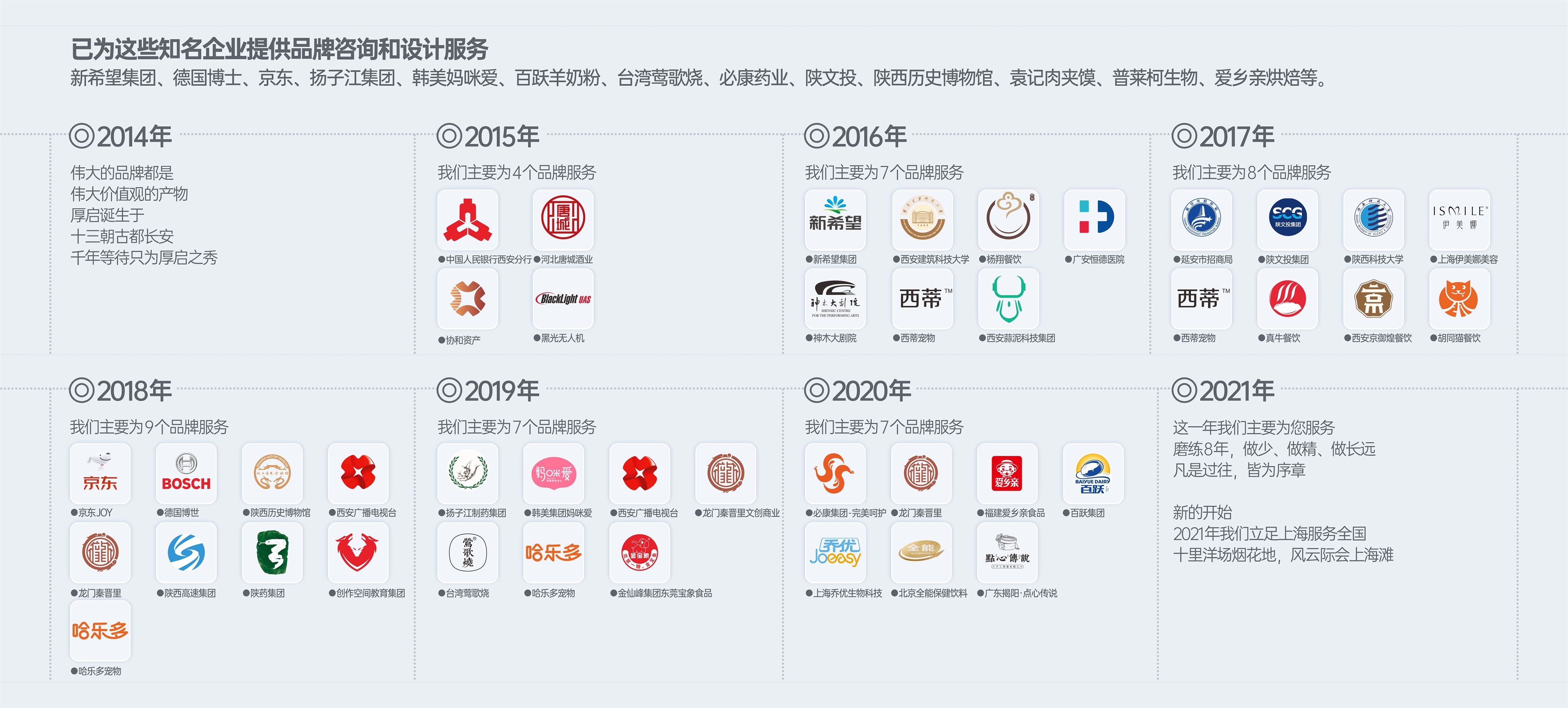 成立6年來始終秉承品牌形象設計的特立獨行,注重思維的透徹與策略的必然,挖掘品牌本體穿透力,銳化品牌自身特質,主張以國際化視野,提供定位于全球商業(yè)領域的品牌視覺形象戰(zhàn)略服務,在專業(yè)領域始終保持旺盛的原創(chuàng)精神和奔騰動力。