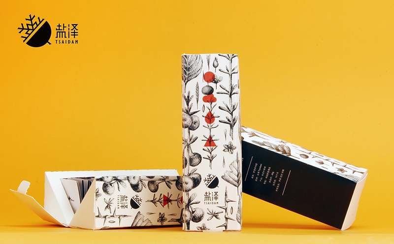 因為很多消費者不知道什么是黑枸杞,所以用創(chuàng)意茶葉包裝的方式畫出黑枸杞的各個時期,以黑枸杞為主要視覺元素。為了給消費者傳達(dá)產(chǎn)品的純天然和自然健康無添加,黑枸杞茶葉包裝設(shè)計上選用了黑白插畫的方式,少許的紅色代表黑枸杞的營養(yǎng)給人帶來的活力和好氣色。產(chǎn)品的包裝盒也經(jīng)過精心的創(chuàng)作,是由兩個連接的三角體組成的長方體,打開后方便拿取。