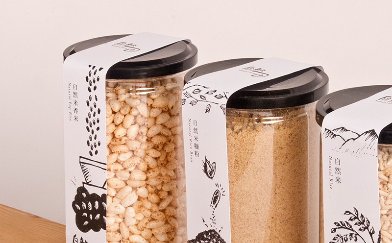 農(nóng)產(chǎn)品品牌標(biāo)志采用手寫體,農(nóng)產(chǎn)品包裝采用“天然農(nóng)場(chǎng)”的雕刻圖像都揭示了農(nóng)場(chǎng)的核心價(jià)值——“原始、樸素、簡(jiǎn)單”。農(nóng)產(chǎn)品包裝圖像主要描述了農(nóng)產(chǎn)品的手工生成過程以及自然環(huán)境,例如:在山丘下的農(nóng)田景色,以及水稻在自然狀態(tài)下生長(zhǎng)的圖片,沒有除草或使用殺蟲劑。通過這些形象,我們希望通過與環(huán)境共生的生活方式傳達(dá)自然農(nóng)場(chǎng)的理想,營造健康的農(nóng)作物。包裝色彩方面采用黑白,同樣傳達(dá)品牌天然健康無添加的理念。