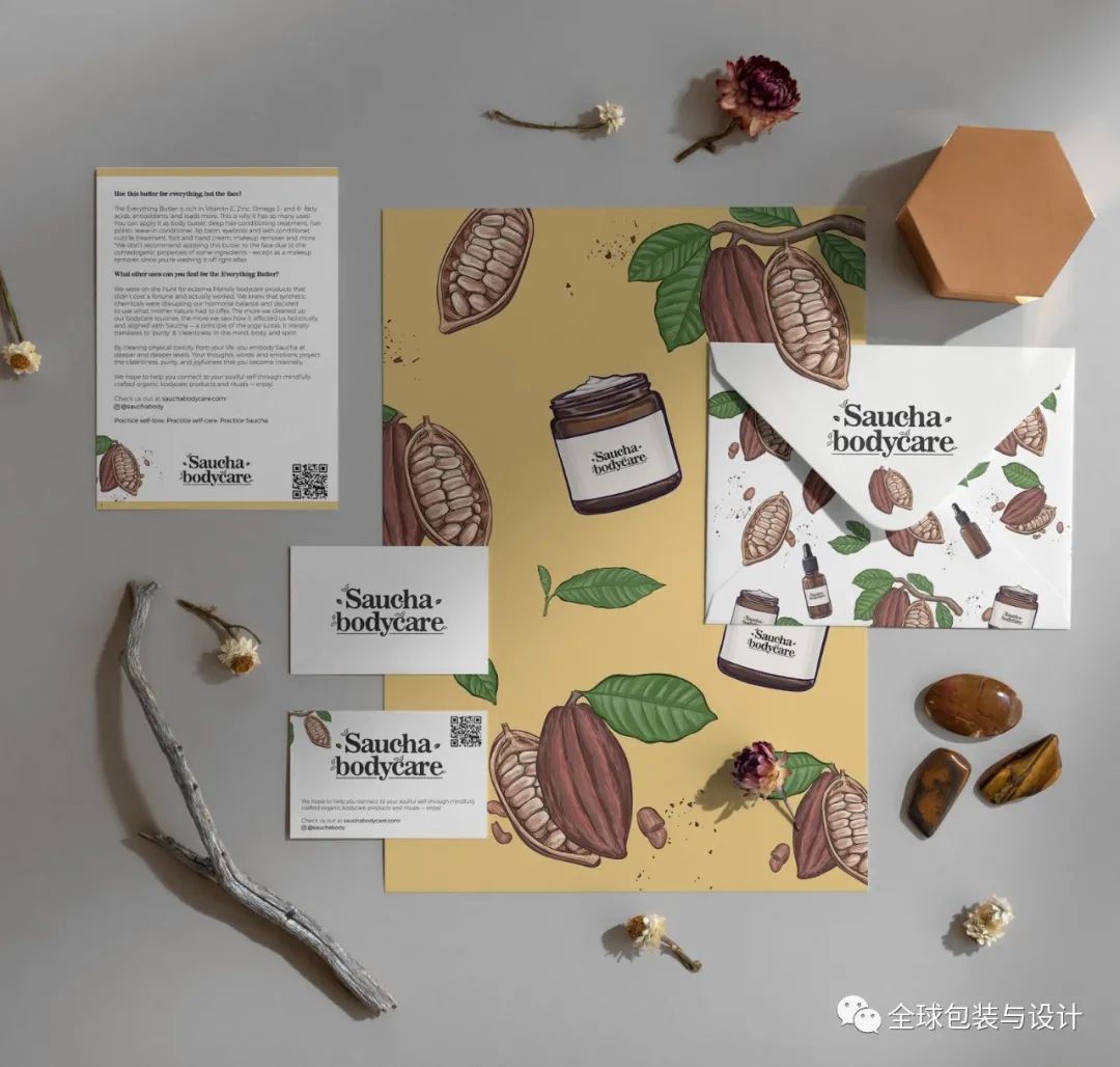 SAUCHA是瑜伽經(jīng)典的一個(gè)原則,字面意思是“純潔”、“潔凈”。這是有機(jī)身體黃油,含有可可脂。因此,決定創(chuàng)作生動(dòng)的可可豆插圖,展示大自然的力量和清新。另外,選擇了鮮艷的顏色和俏皮的風(fēng)格,所以品牌感覺(jué)很友好。
