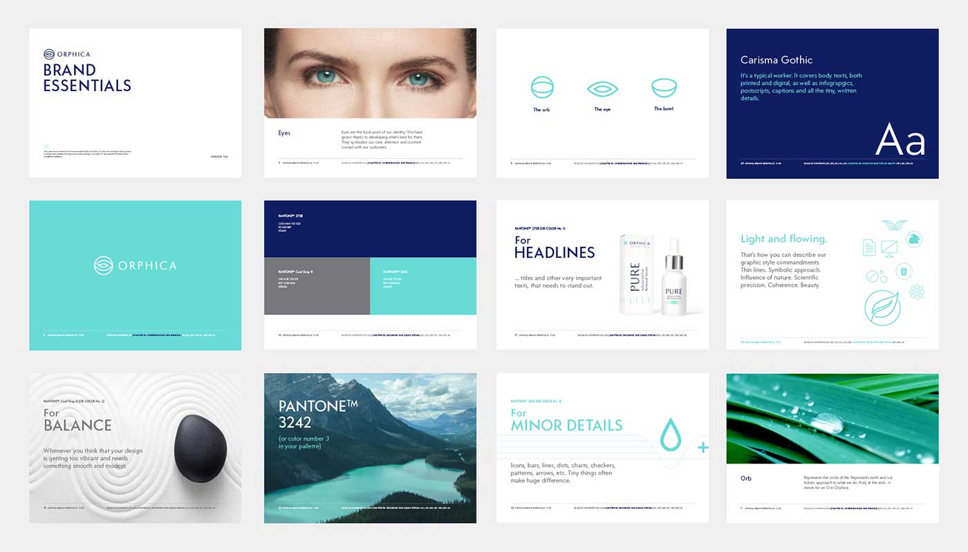我們用三個(gè)元素創(chuàng)造了這個(gè)化妝品商標(biāo),這對(duì)品牌的形象很重要——眼睛,水和球——來(lái)代表生命的循環(huán)。我們選擇了淺色的字體和柔和的顏色。我們還選擇了薄荷作為整個(gè)品牌的主要顏色,因?yàn)樗o品牌賦予了一種皮膚病的感覺