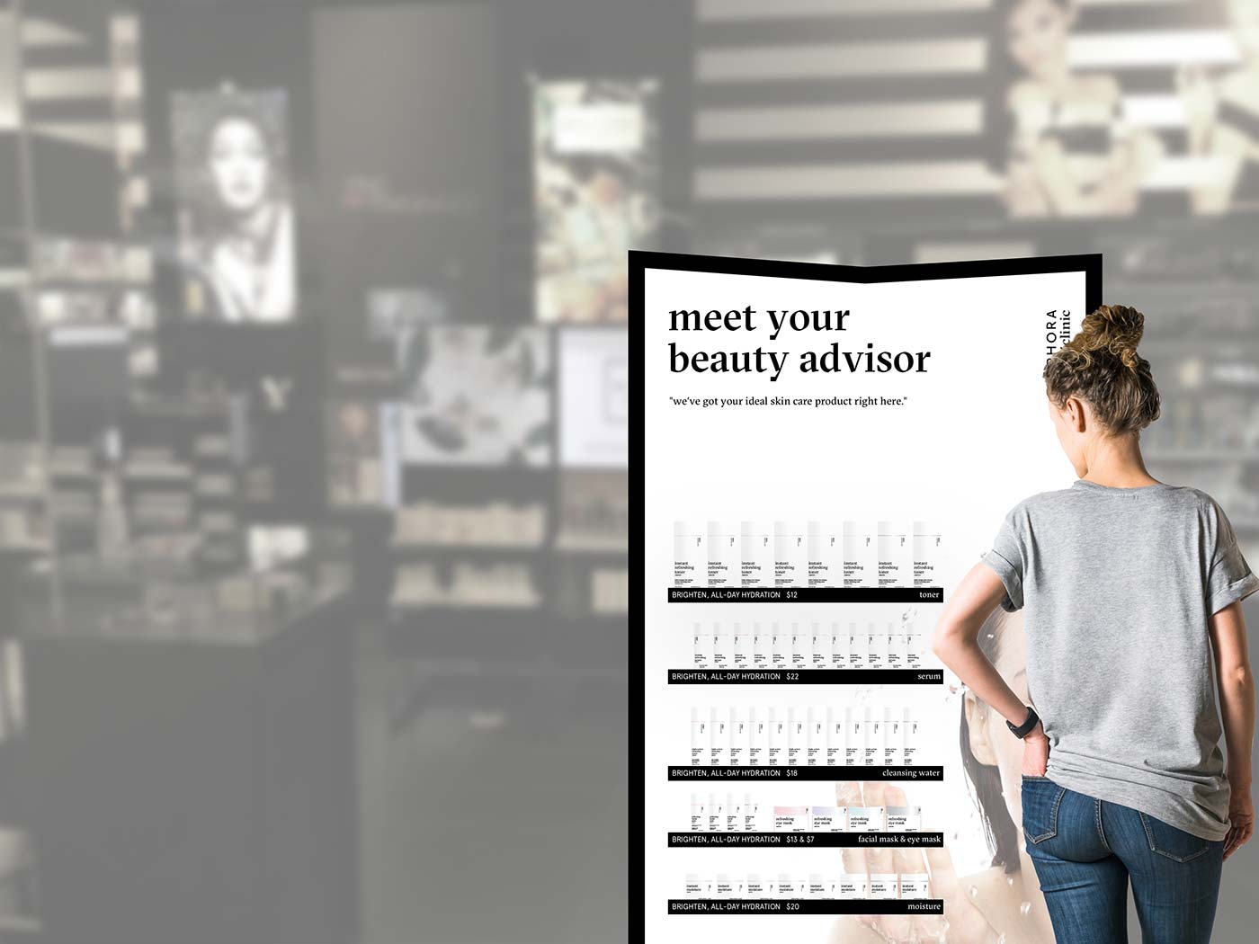 波普:交互式顯示:在POP的前面,你可以很容易地連接到你的手機(jī)與顯示器的屏幕。整個(gè)顯示器由一個(gè)屏幕組成。一旦屏幕和你的手機(jī)連接好了,你可以做一個(gè)簡(jiǎn)短的調(diào)查,根據(jù)你的皮膚問題找到合適的產(chǎn)品。有關(guān)產(chǎn)品的詳細(xì)描述將通過(guò)應(yīng)用程序提供?;谀銓?duì)皮膚的關(guān)注,這個(gè)應(yīng)用程序?qū)槟阃扑]合適的產(chǎn)品。