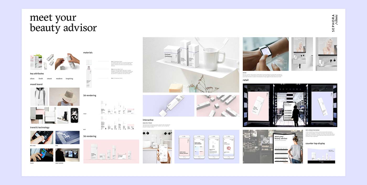 項(xiàng)目簡(jiǎn)介:通過(guò)包裝的互動(dòng)體驗(yàn)。未來(lái)的交互式包裝會(huì)是怎樣的?在不久的將來(lái)會(huì)有哪些發(fā)展中的技術(shù)應(yīng)用?你如何設(shè)想品牌如何在包裝、品牌、廣告和零售體驗(yàn)中利用這些新興技術(shù)?絲芙蘭診所是絲芙蘭的新護(hù)膚系列。通過(guò)利用數(shù)字技術(shù),客戶可以以一種聰明和簡(jiǎn)單的方式管理他們的皮膚狀況,所以他們可以保持他們的皮膚新鮮。他們將有一個(gè)互動(dòng)的體驗(yàn),從絲芙蘭商店到他們的家??蛻魧⑴c包裝、零售、應(yīng)用和智能手表方面的技術(shù)互動(dòng)。Sephora診所可以很容易地銷售給各種各樣的人,但具體的目標(biāo)群體是千禧一代。
