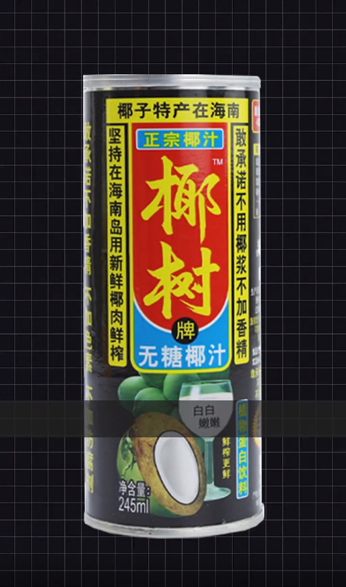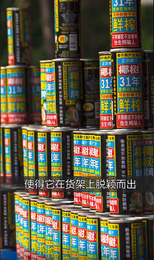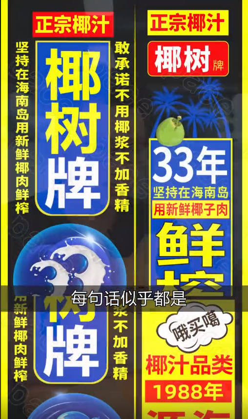 而且不浪費任何一個角落,滿滿地用不同色塊堆上了關(guān)鍵字,親媽般的將椰樹椰汁的全部優(yōu)點集中于包裝上,每句話似乎都是掏心窩子的大實話,“正宗”、“不加香精”、“新鮮椰子肉”、“海南特產(chǎn)”.....