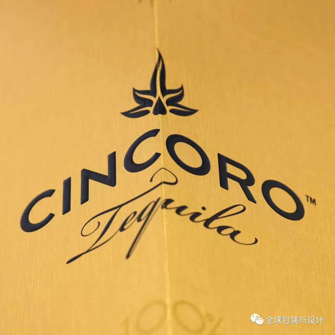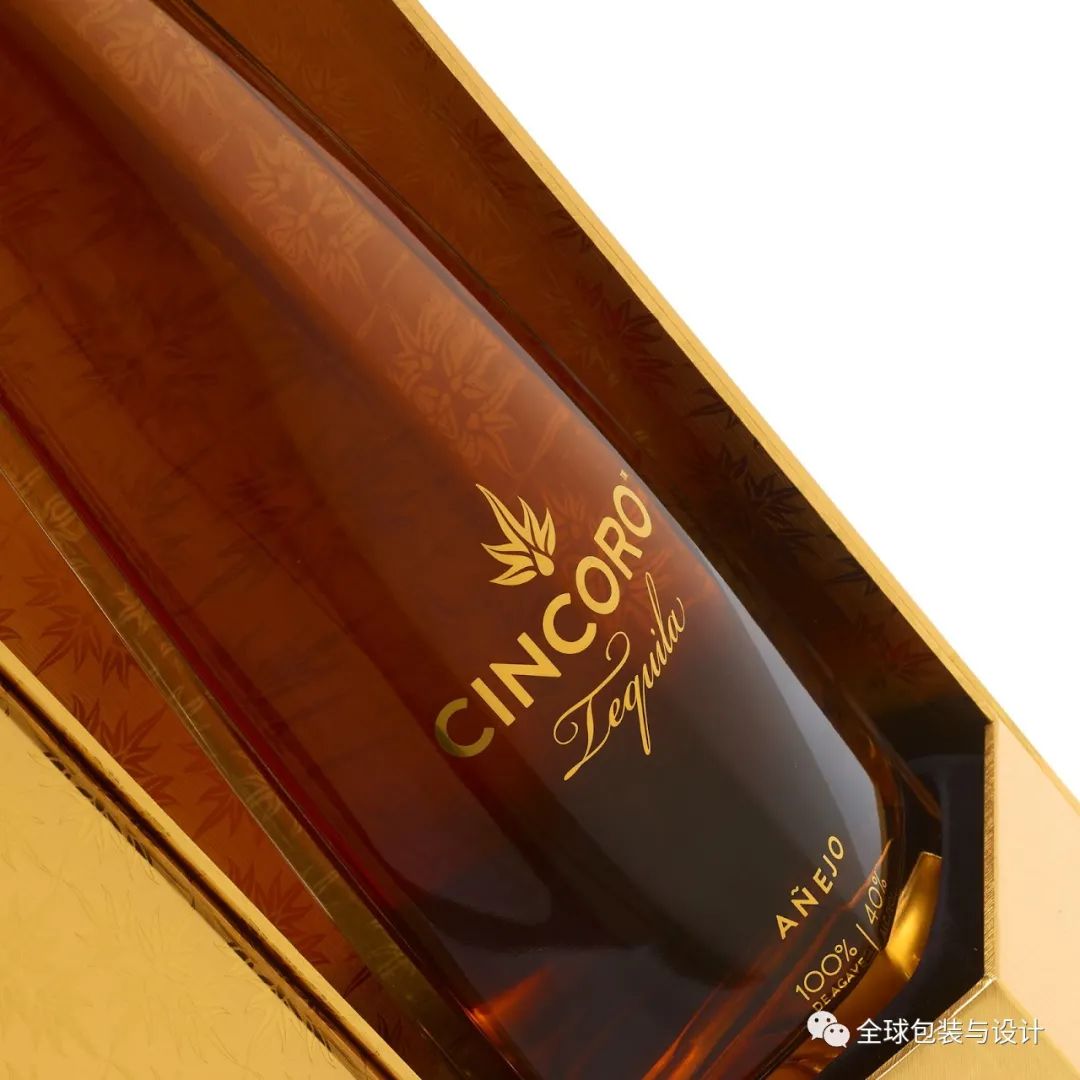 靈感來自瓶底,這包有五個面,其中兩個折疊打開,露出龍舌蘭酒。整個包裝包裹在印有Cincoro標志重復(fù)圖案的高級金紙中,并點綴有啞光和光澤區(qū)域。瓶子本身被牢固地固定在底部配件和蓋子扣環(huán)之間,確保運輸過程中保持安全。