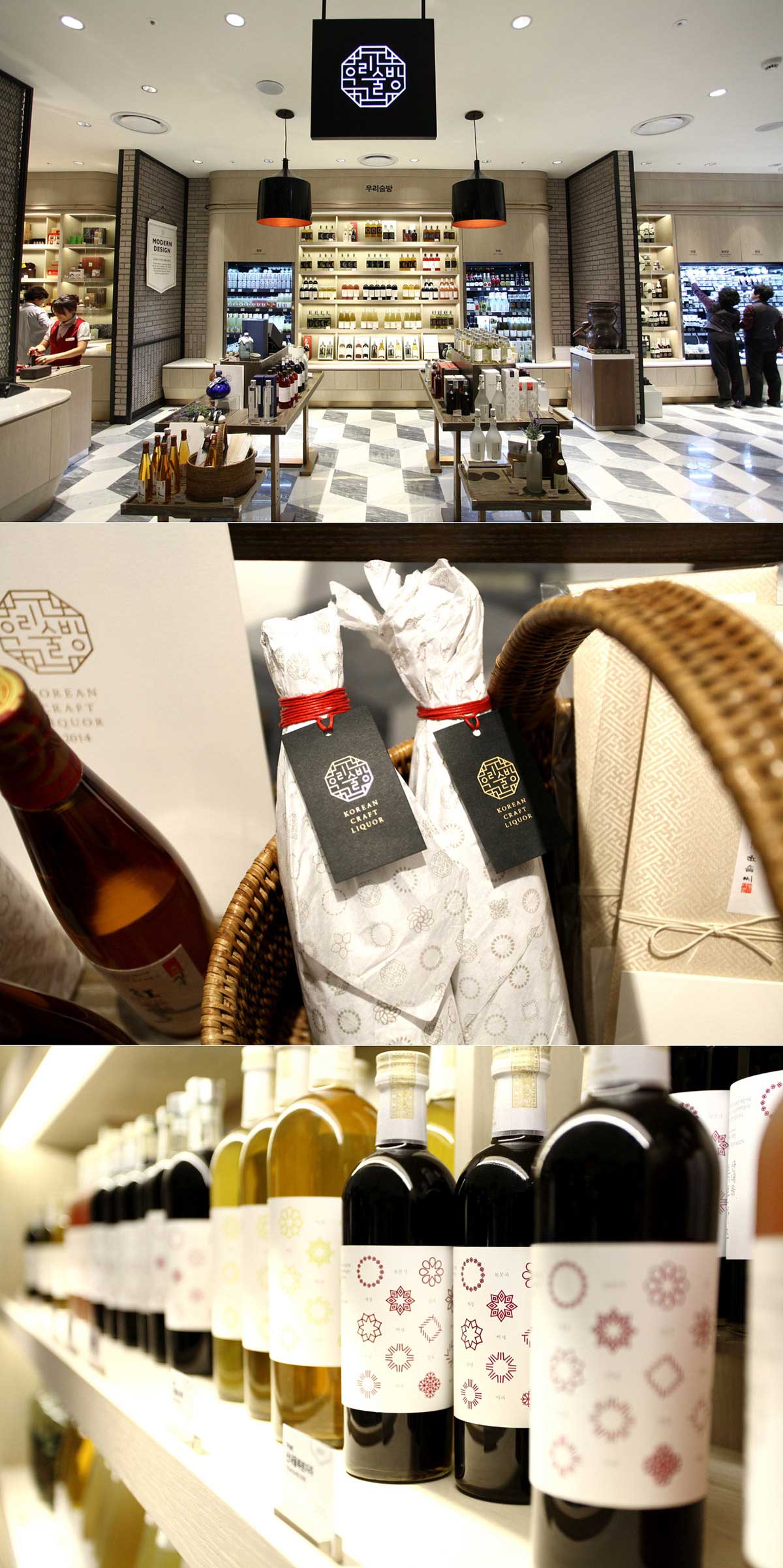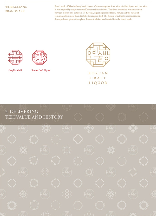 Woorisulbang的商標有三種酒:水果酒、蒸餾酒和米酒。白酒標志的設計靈感來自韓國傳統(tǒng)大門的圖案。這些門象征著室內(nèi)和室外的交流。對韓國人來說,白酒代表著食物、文化和交流的方式,而不是酒精飲料本身。在整個韓國傳統(tǒng)中,通過共享眼鏡進行真實交流的特征被融入到商標中。
