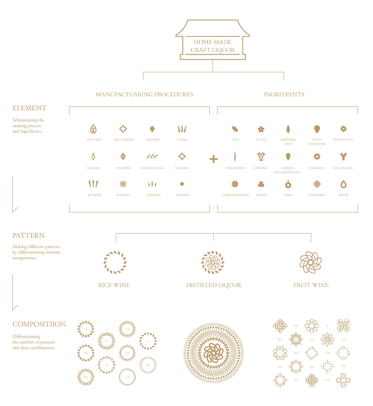 對于此次的酒產(chǎn)品包裝設計,我們扣除了這三個主要設計關鍵詞。以差異化區(qū)分水果酒、米酒和蒸餾酒,基于其生產(chǎn)過程和靈活性,區(qū)分水果酒,米酒和蒸餾酒的制造程序和靈活性,以通過獨特的過程反映來自各個地區(qū)的不同成分的三個特征。