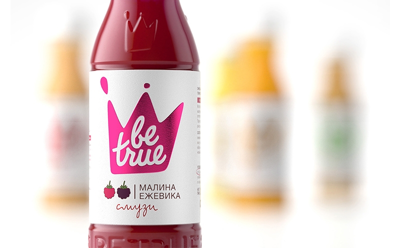 真奶昔品牌文化的核心是講究誠實(shí)和真實(shí),體現(xiàn)在新的符號上——由飛濺的冰沙構(gòu)成的冠軍圖案,圖案的顏色由對應(yīng)的果汁顏色決定,標(biāo)志使用紋理紙上的壓花箔,強(qiáng)調(diào)了品牌特權(quán),也為包裝上增貼了不同的手感。因?yàn)槊靠町a(chǎn)品都是由不同的水果混搭而成,所以每款產(chǎn)品的冠軍圖案下面都有兩個簡單的水果插畫,向消費(fèi)者提供飲品口味的說明,為包裝設(shè)計增加了靈活度和親和度。標(biāo)簽邊緣兩端組成的果樹,是這次包裝設(shè)計的另一個有趣的地方,它是產(chǎn)品重要的補(bǔ)充信息圖表,是在向消費(fèi)者說明每款產(chǎn)品由哪些元素構(gòu)成。