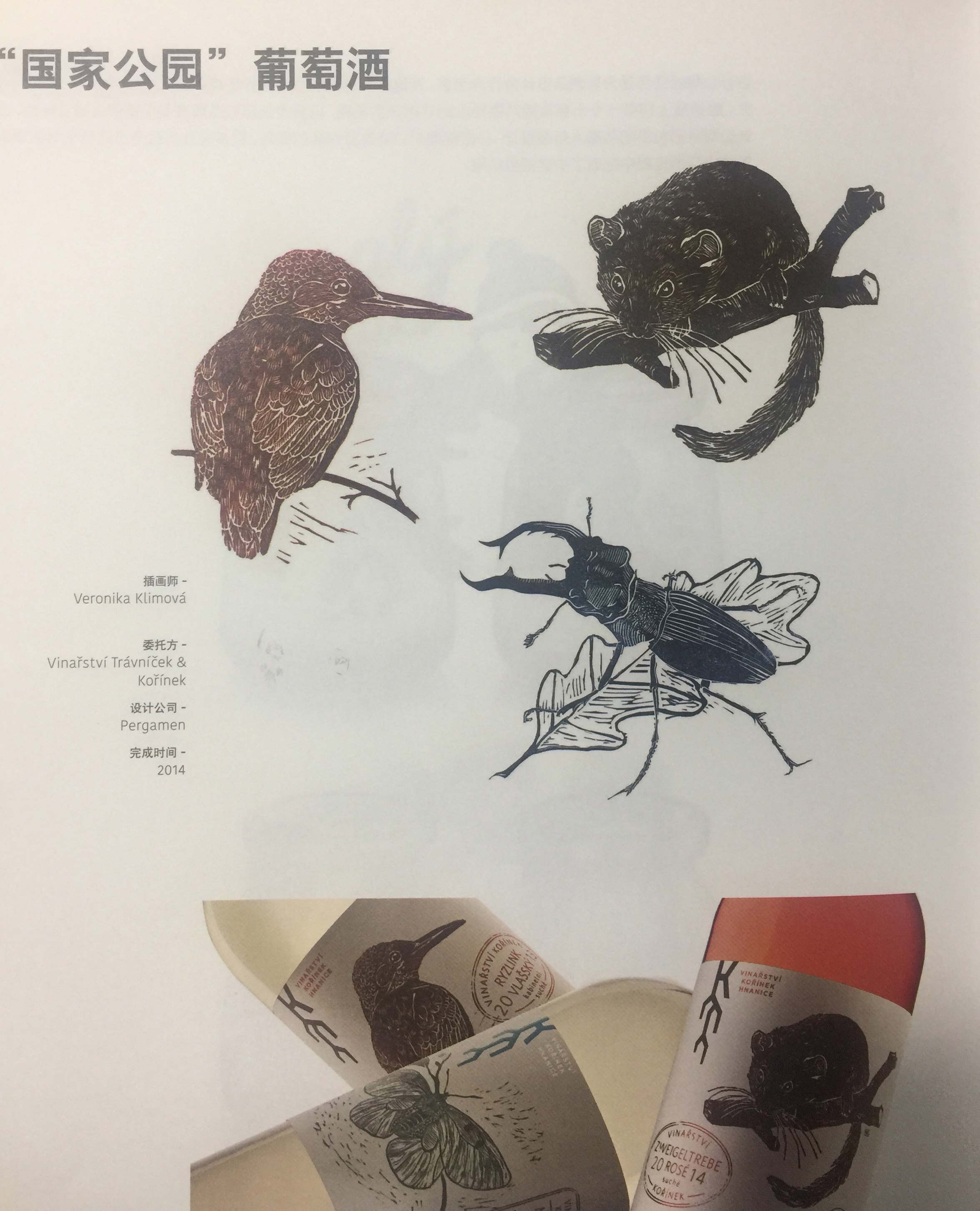 釀酒廠的葡萄園位于塔亞河流域的國(guó)家公園邊境處。因此,設(shè)計(jì)公司決定將這一葡萄酒系列產(chǎn)品命名為“來(lái)自國(guó)家公園的問(wèn)候”繪制生活在國(guó)家公園內(nèi)動(dòng)物的插畫(huà),并以此作為商標(biāo)的主題。這些插畫(huà)采用版畫(huà)技術(shù)印制而成,用以凸顯這一系列產(chǎn)品的獨(dú)特釀造工藝。每種包裝上都配有一種動(dòng)物的插畫(huà),以便選購(gòu)者對(duì)葡萄酒的品種進(jìn)行區(qū)分。單色印刷的圖形著色略有不同,給人一種直接從雕版中拓印出來(lái)的錯(cuò)覺(jué)。上好的葡萄酒、獨(dú)具匠心的設(shè)計(jì)和眾多國(guó)際設(shè)計(jì)獎(jiǎng)項(xiàng)使這家釀酒廠在捷克共和國(guó)最受歡迎的釀酒廠評(píng)選中贏得了第二名。