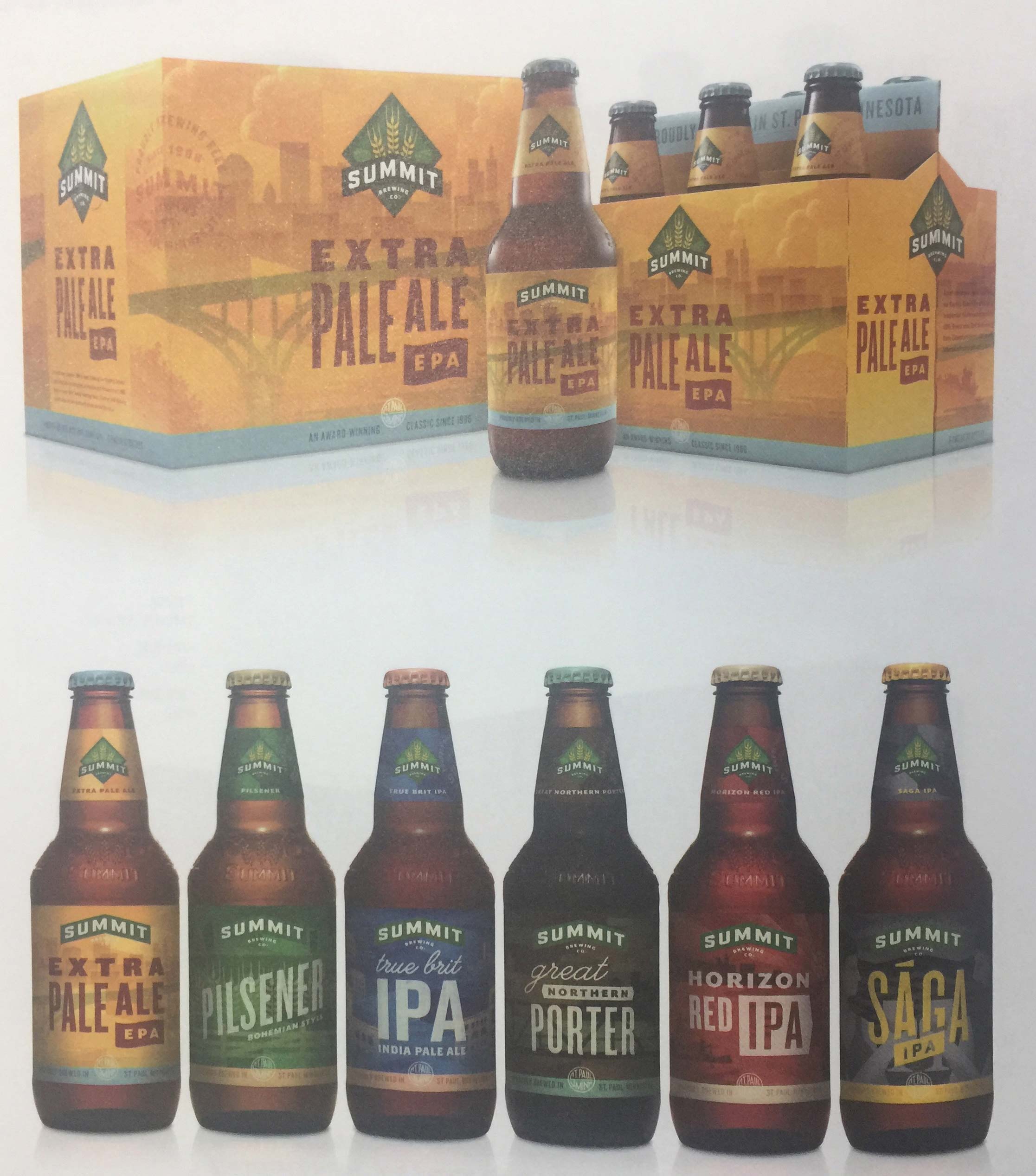 啤酒包裝上的插畫為拼貼畫,描繪的是公司所在地——明尼蘇達(dá)州圣保羅的景象,并結(jié)合每款啤酒的特殊配方和原料設(shè)計(jì)而成。關(guān)于Summit釀造和個(gè)性化產(chǎn)品的故事不僅有助于展現(xiàn)獨(dú)特的品牌個(gè)性,而且實(shí)現(xiàn)了個(gè)性化包裝與整體“家庭”感覺的完美結(jié)合,并對(duì)手工釀造技術(shù)予以特別關(guān)注。