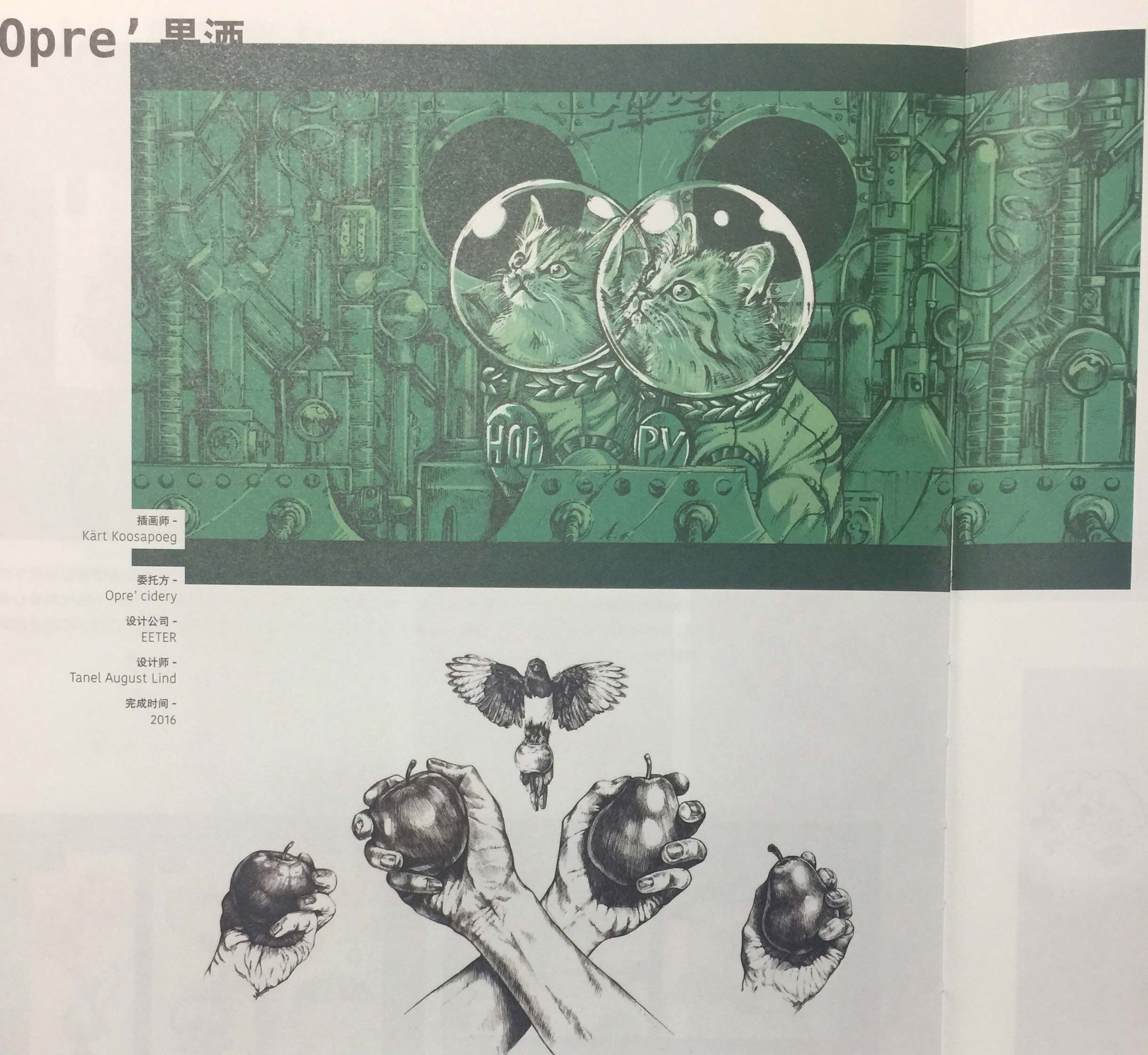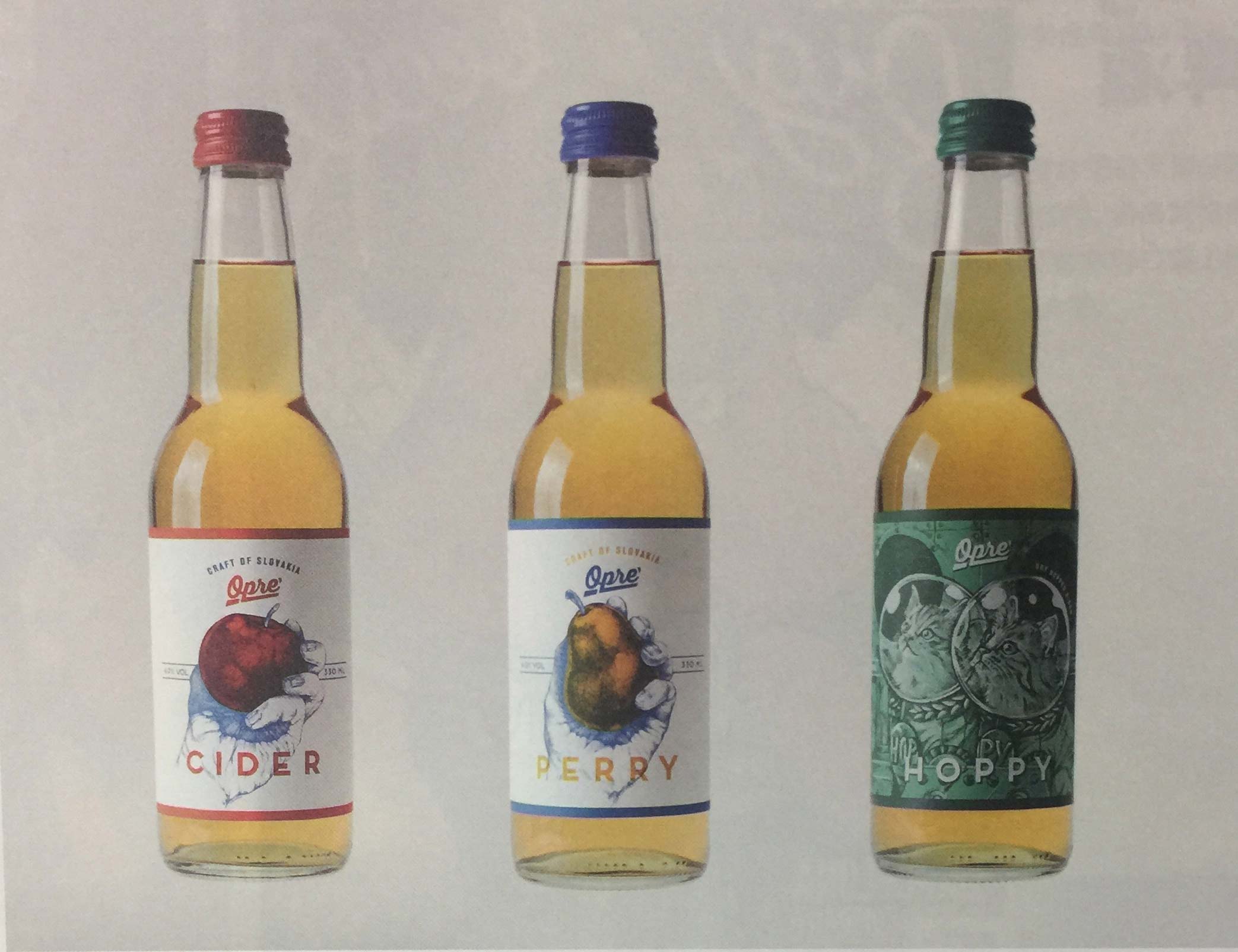 蘋果酒和梨子酒瓶身上的手繪插畫是以講述工匠故事及那些他們引以為傲的古老木雕刻品為靈感設(shè)計的,展現(xiàn)產(chǎn)品口味的同時,以無形的方式建立起與產(chǎn)品的聯(lián)系。Hoppy是一種加過酒花的干型蘋果酒,酒花的加入賦予這種果酒以獨特的味道。由于這種果酒的名字并未向消費者透漏過多的信息,因此,設(shè)計公司從20世紀90年代的捷克斯洛伐克漫畫和蘇聯(lián)太空探險狗的原型汲取靈感,設(shè)計出這種果酒瓶身上的插畫。這些新制的蘋果酒是當?shù)匾环N可以替代進口巴氏消毒含糖飲料的可口飲品,而Opre’也迅速成為一個重要的蘋果酒品牌。