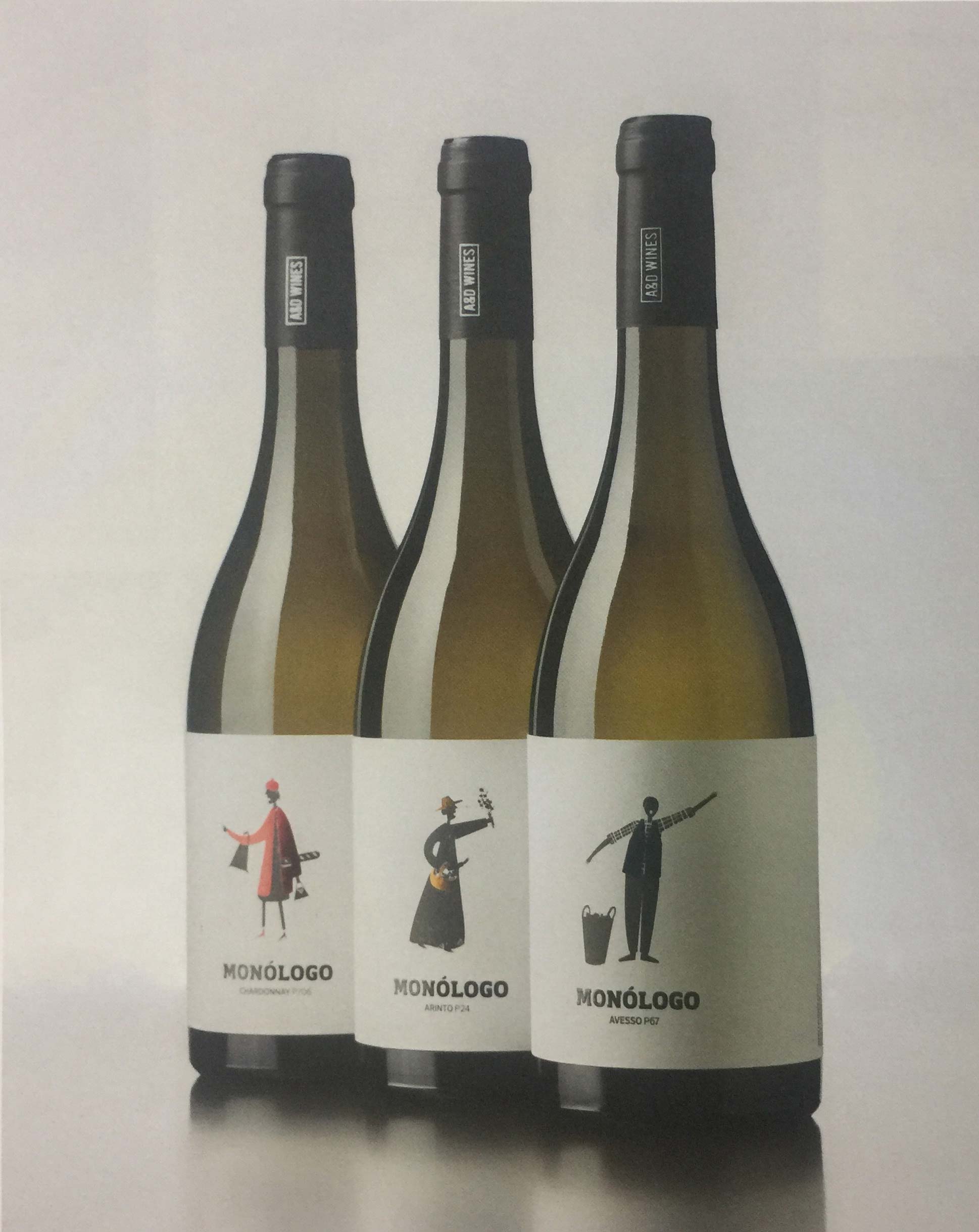 這是一款產(chǎn)自巴揚(yáng)地區(qū)的葡萄牙綠葡萄酒系列產(chǎn)品,之所以選擇將這一系列的產(chǎn)品命名為Monologo,是因?yàn)檫@個詞與戲劇有著緊密的聯(lián)系。每款葡萄酒的瓶身上都繪有一個處在舞臺燈光之下的演員,他們正在向消費(fèi)者介紹一種特別的葡萄品種。例如,Arinto是一種產(chǎn)自葡萄牙巴揚(yáng)地區(qū)的葡萄品種。用這種葡萄釀制的酒,瓶身上繪有一個身著巴揚(yáng)地區(qū)傳統(tǒng)服飾,手持果籃和一束鮮花的婦女形象。Chardonnay是一種原產(chǎn)自法國的葡萄品種,因此,設(shè)計(jì)師為這款葡萄酒設(shè)計(jì)了一個頭戴貝雷帽、胳膊下夾著法棍面包的法國女郎形象。