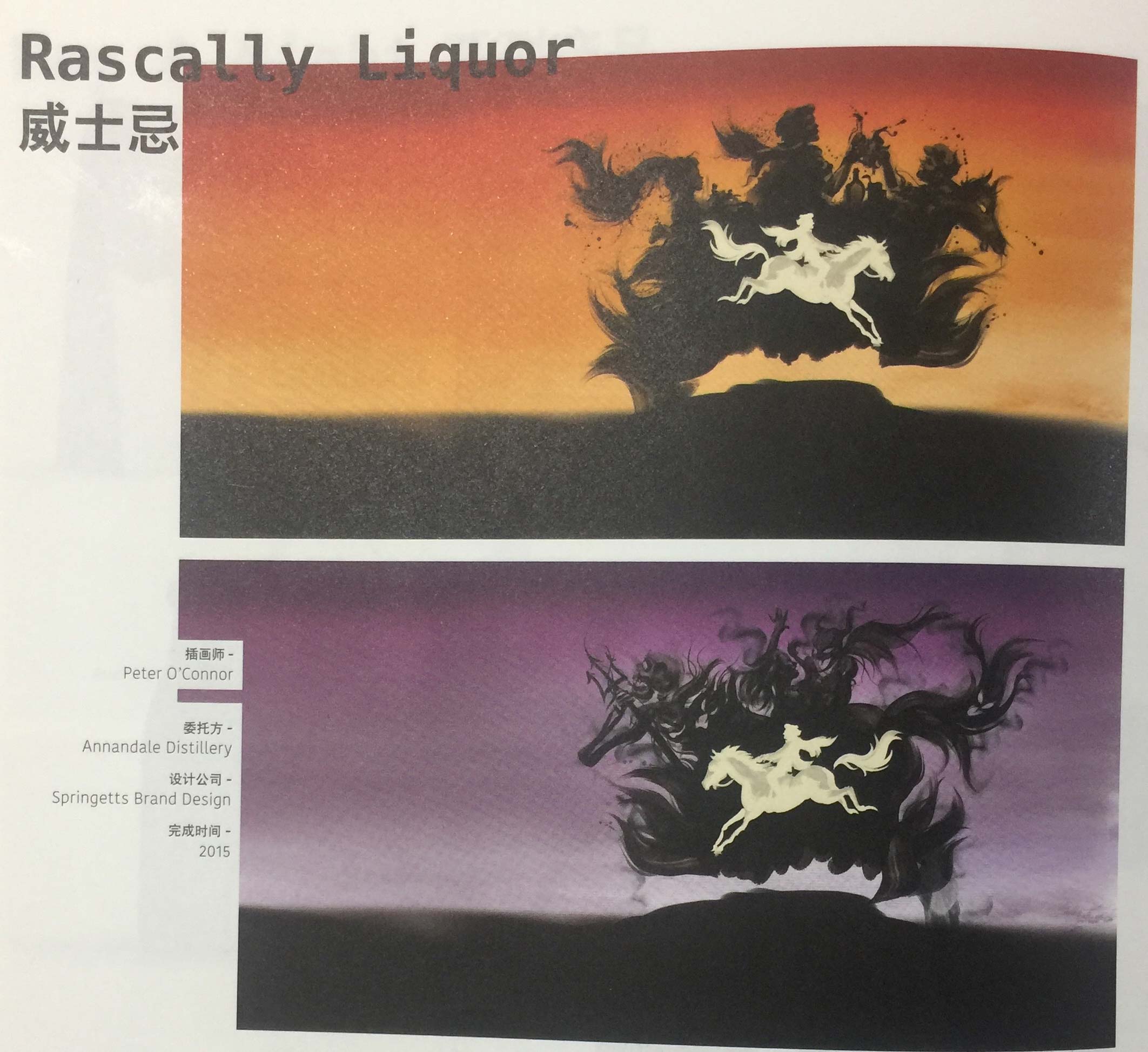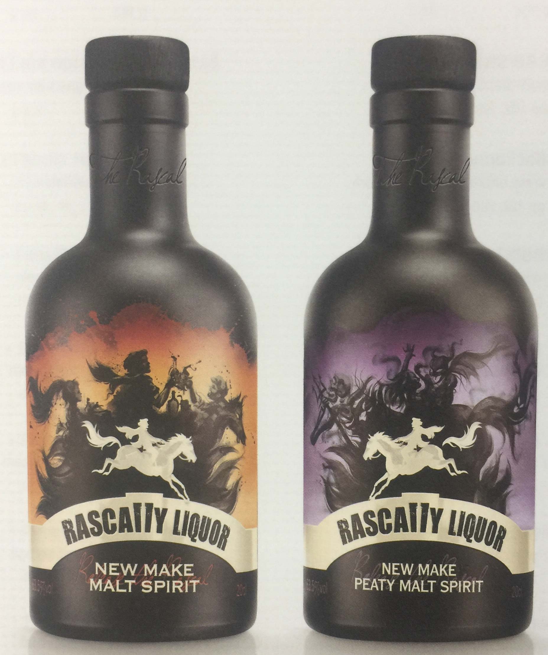 設(shè)計(jì)公司接受委托方要求為其打造一個(gè)品牌,并為該品牌的兩款烈性酒的包裝進(jìn)行設(shè)計(jì)——煙熏口味的烈酒和水果口味的烈酒。設(shè)計(jì)公司提出了“釋放內(nèi)心的不羈”的品牌理念。享用這兩款烈性酒時(shí),消費(fèi)者可以釋放內(nèi)心的不羈,因此,設(shè)計(jì)師決定將這兩款烈性酒命名為Rascally Liquor(無(wú)賴的酒)。這種表達(dá)不僅清楚地反映出產(chǎn)品的特性,而且還可以暗指詩(shī)人Robert Burns(羅伯特.彭斯)對(duì)低地蘇格蘭威士忌的評(píng)價(jià):“蘇格蘭威士忌是一種放蕩不羈的烈酒,因而只有那些放蕩不羈的人才能享用?!盩am O’Shanter 這個(gè)人物(出自羅伯特.彭斯的詩(shī)歌)體現(xiàn)了產(chǎn)品不羈的特性,也是包裝意象設(shè)計(jì)的靈感來(lái)源。