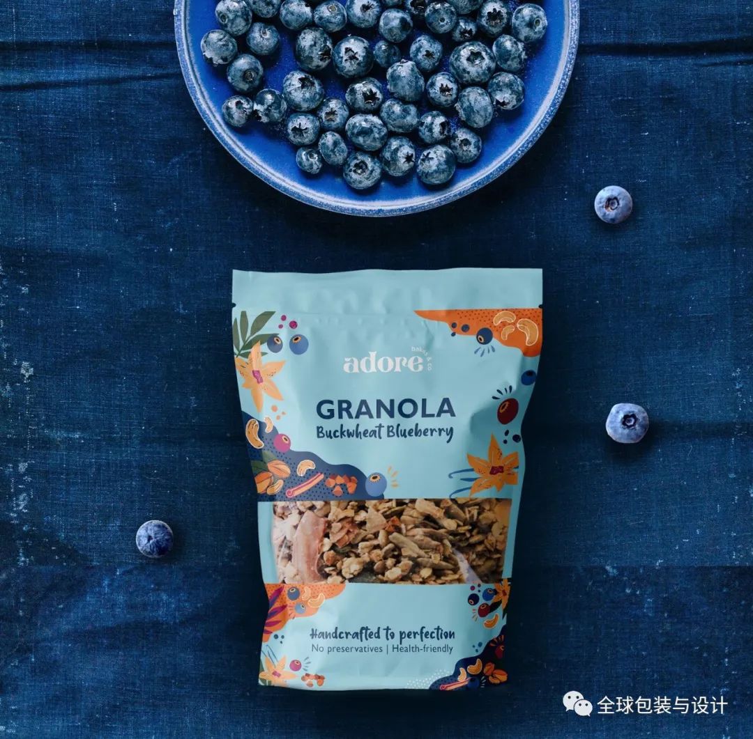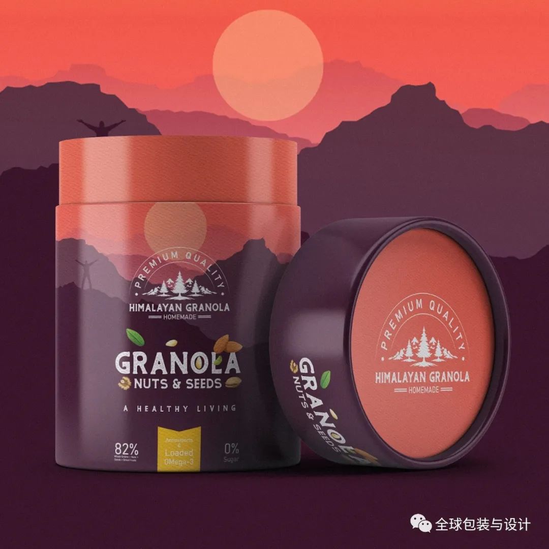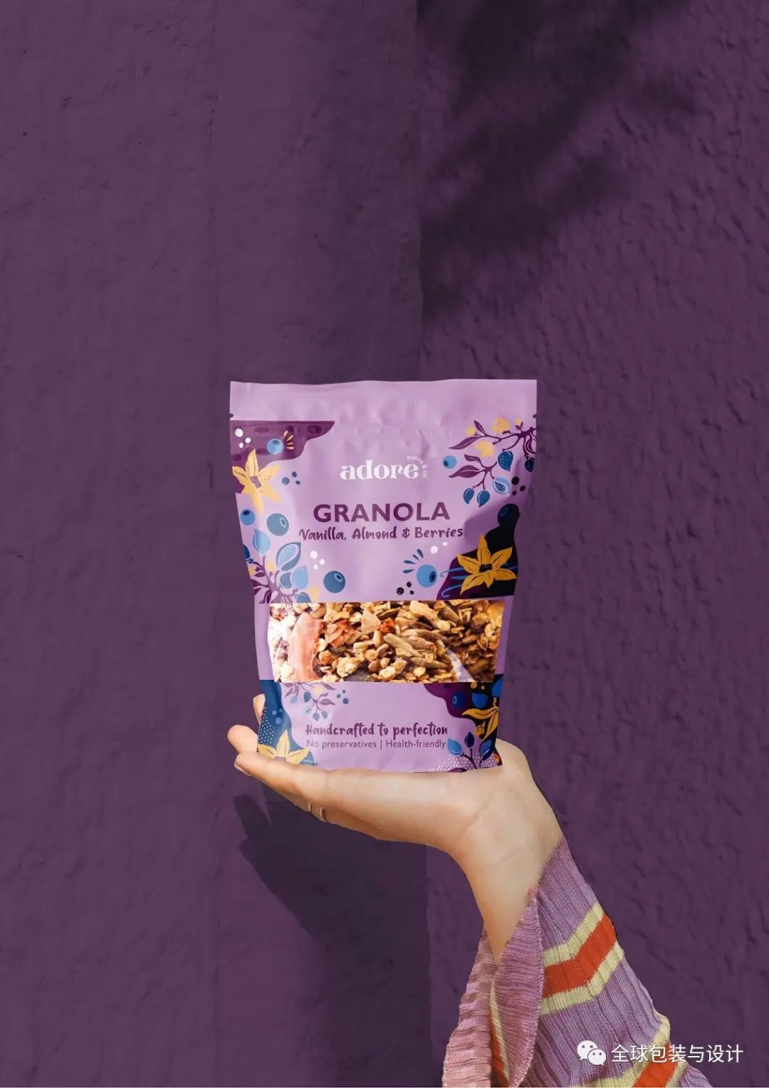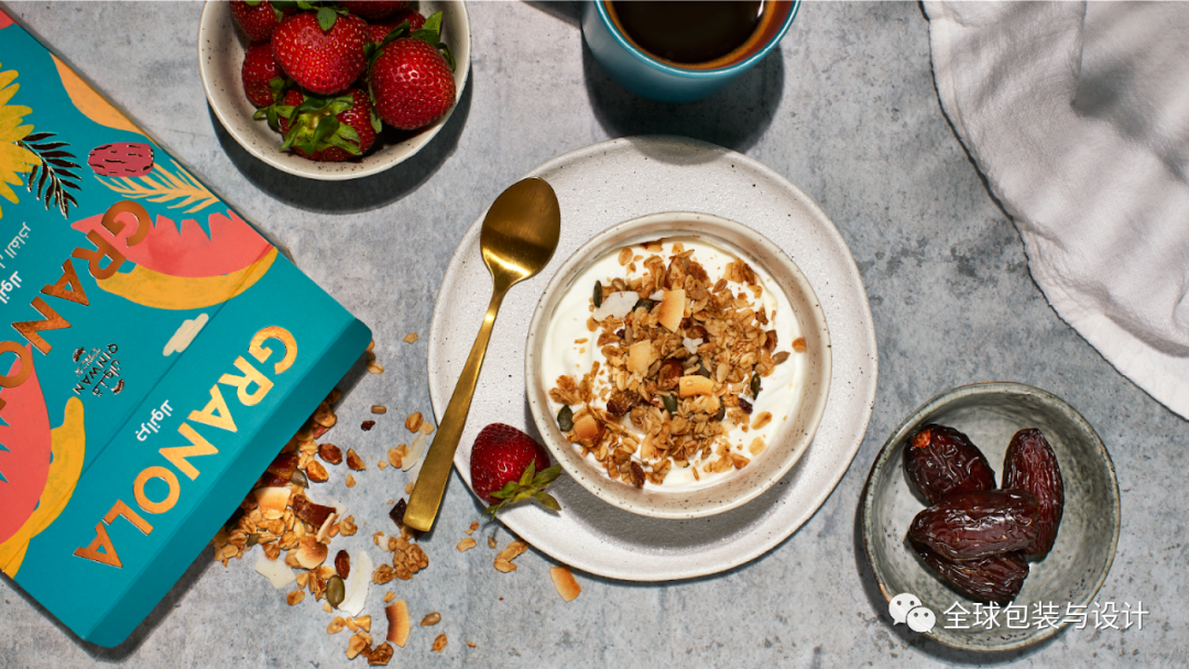 品牌的靈感來自帶有現(xiàn)代氣息的前衛(wèi)審美。它意味著有趣和高級。一個(gè)充滿活力的調(diào)色板被用來根據(jù)口味的變化來吸引人們對包裝的注意。配以格蘭諾拉麥片成分的醒目插圖。