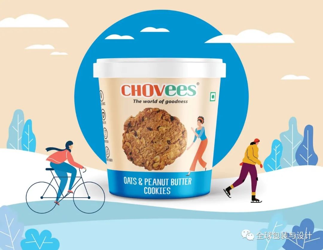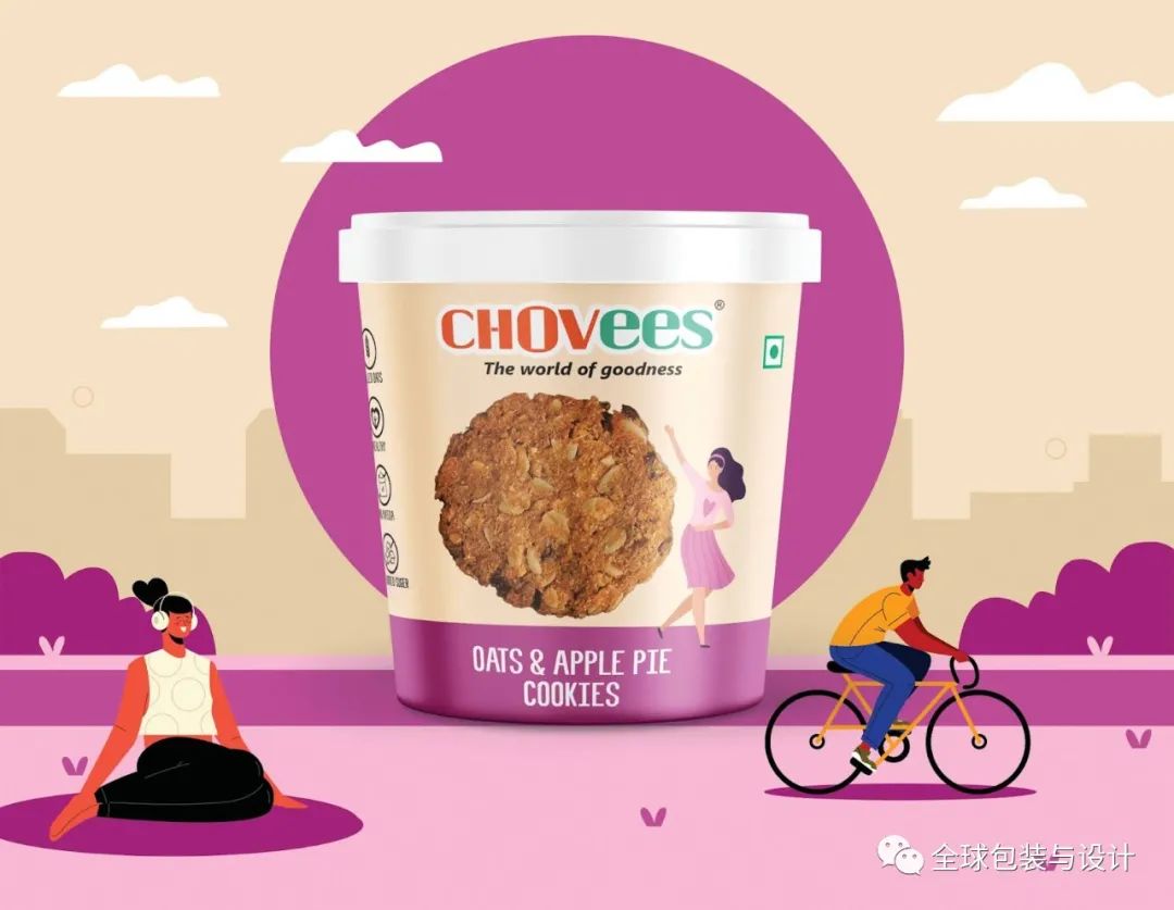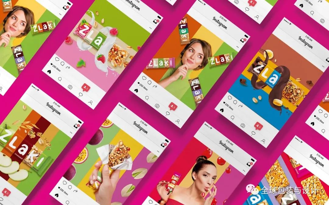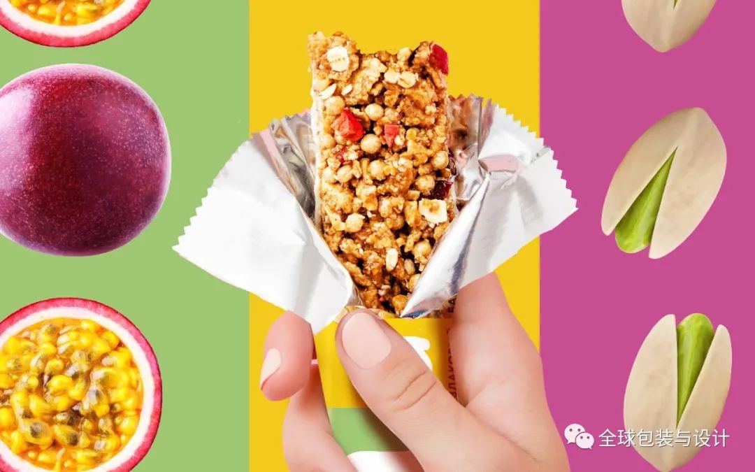 引人注目的,清爽充滿活力的色調(diào)被用于為品牌打造年輕時尚的包裝。每一種美食都以新鮮的顏色介紹,背景是人們從事各種以健康和健身為中心的活動。