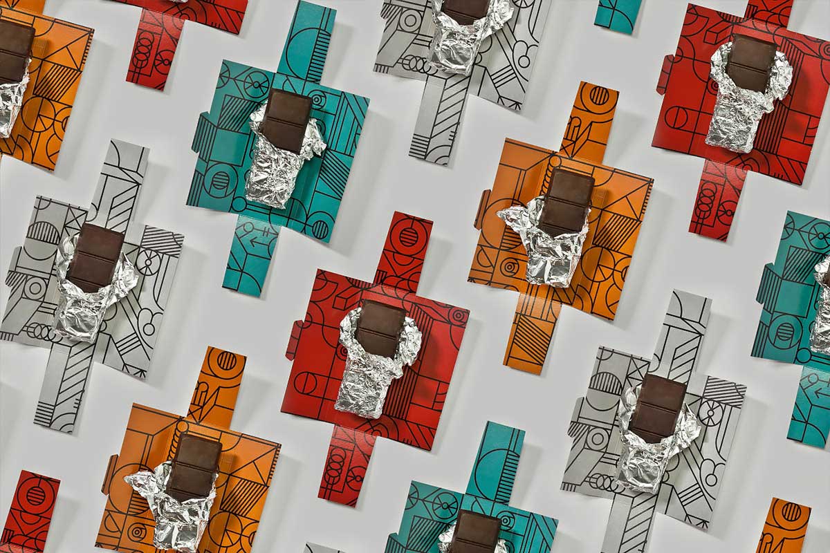 這種驚人的有機(jī)生巧克力只有兩種成分:不同百分比的可可粉和糖。 設(shè)計(jì)的視覺識(shí)別和包裝系統(tǒng)具有相同的表現(xiàn)形式:一種“廉價(jià)”的原紙板和一種“豪華”的金屬熱箔,每種巧克力包裝形式一模一樣,用顏色來區(qū)分。