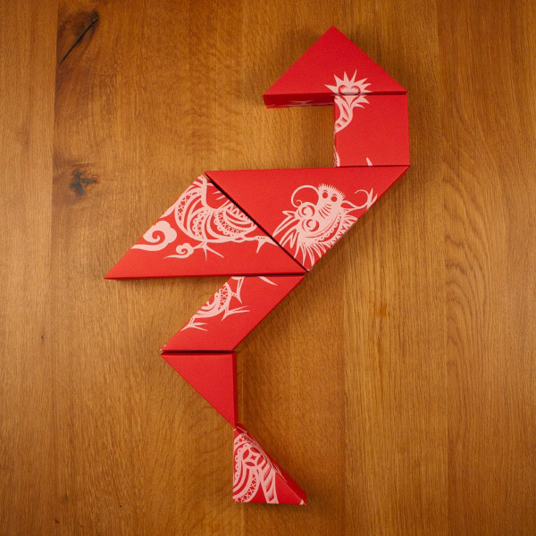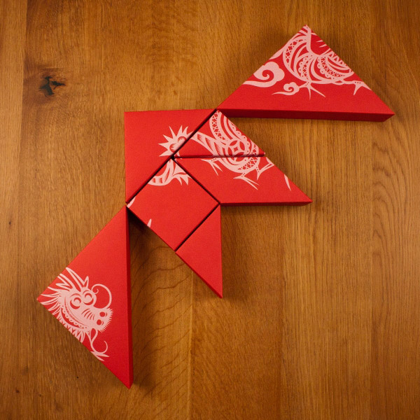 中國的朱砂紅包裝的七種不同的食品。在食用了這些美味的東西后,盒子可以被用作七巧板,孩子們可以隨意的將它們組合成各種吉祥的動物。