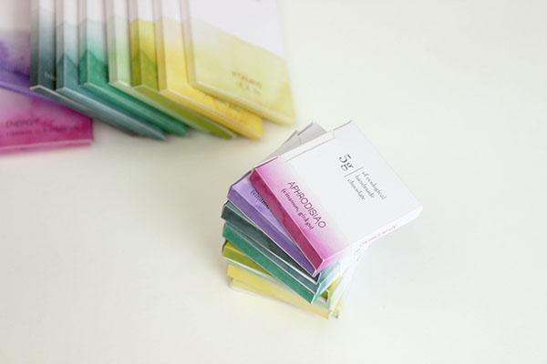 兒此次的包裝設計就是通過不同的表現(xiàn)形式去實現(xiàn)不同功能的巧克力屬性。最終設計師通過不同的水彩畫面去執(zhí)行巧克力的包裝設計。