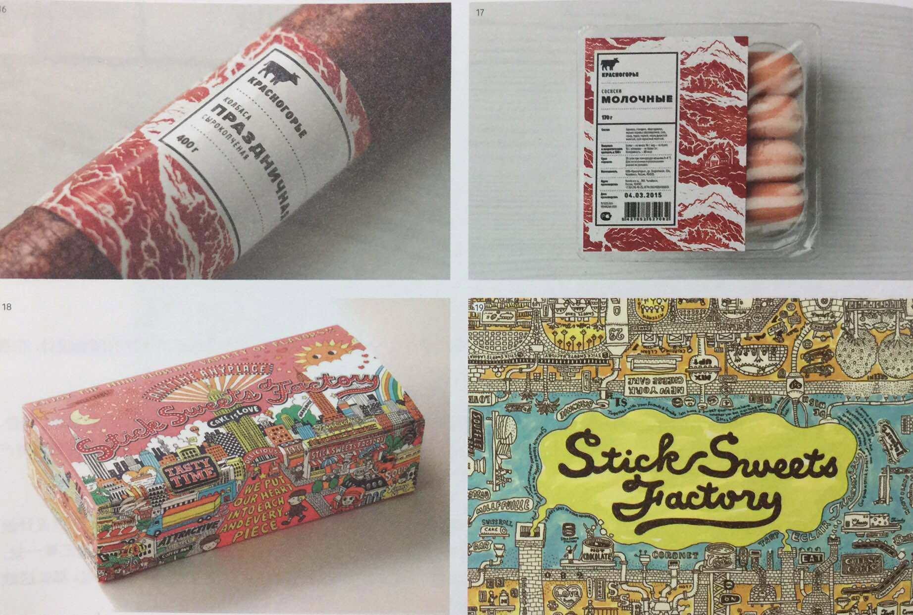 這種吸引力有時(shí)甚至可以產(chǎn)生一種催眠作用,如Krasnogorie香腸,產(chǎn)品包裝展現(xiàn)了一幅從遠(yuǎn)處便能辨識(shí)出這是一種肉類(lèi)產(chǎn)品的插畫(huà),但是近看之下,產(chǎn)品包裝卻是一個(gè)視覺(jué)謎題:肉類(lèi)紋理之中隱藏著一道鄉(xiāng)村自然景觀(guān),給人眼前一亮的感覺(jué)。