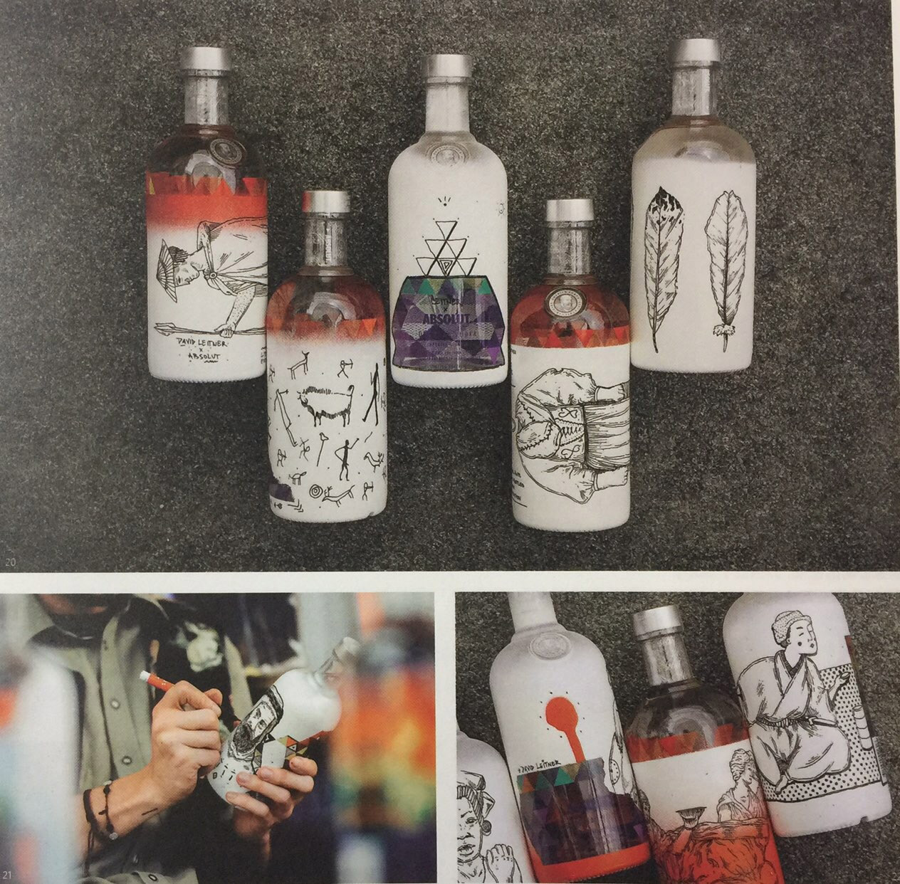 奧地利藝術(shù)家David Leitner將插畫(huà)直接繪制在A(yíng)bsolut伏特加的瓶身上,插畫(huà)上的人物是根據(jù)藝術(shù)家游歷亞洲時(shí)的所見(jiàn)所聞及老式雜志上的圖片設(shè)計(jì)的。這種酒瓶在奧地利國(guó)內(nèi)僅有25個(gè),僅在幾分鐘之內(nèi)便被銷(xiāo)售一空。