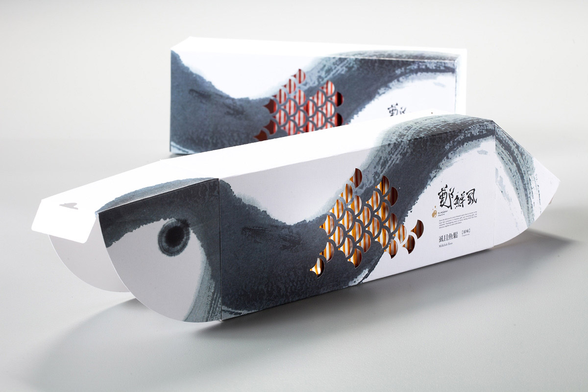 4.外包裝以傳統(tǒng)水墨的揮毫營造虱目魚的意象,灰階色系取自虱目魚本身的銀灰色。