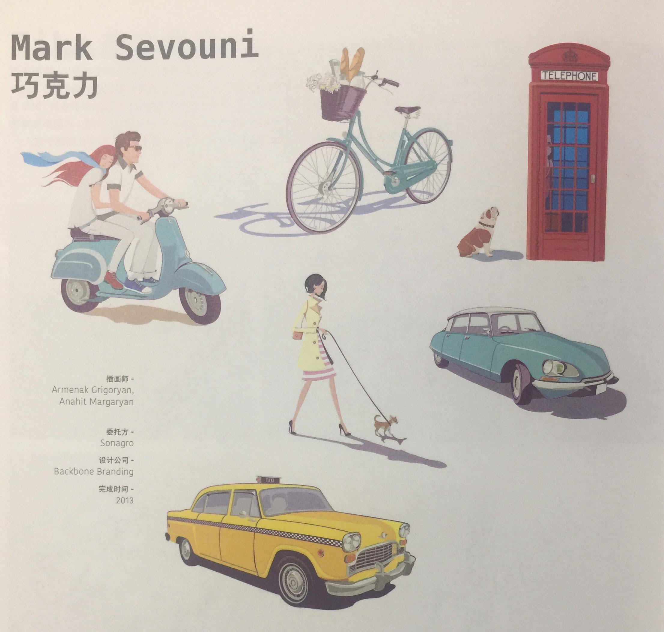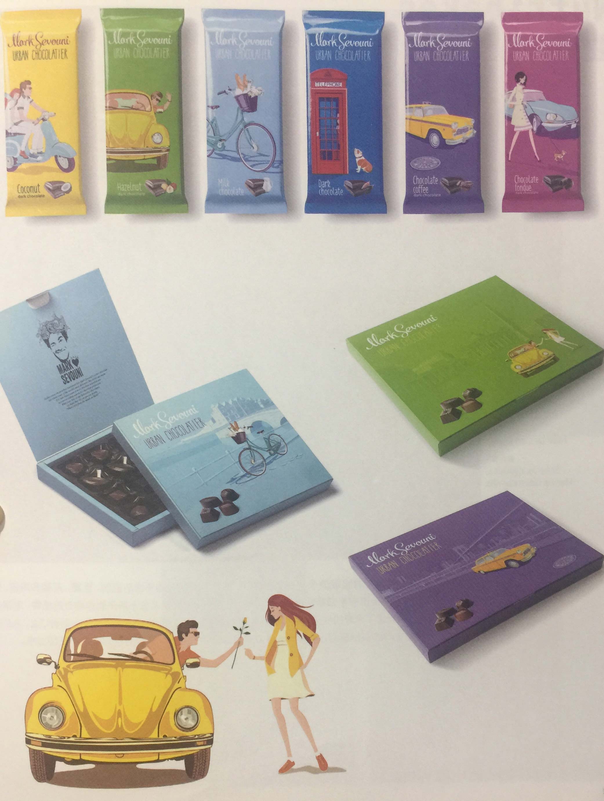 該設(shè)計(jì)旨在突出與其他產(chǎn)品不同的城市巧克力特點(diǎn)。設(shè)計(jì)公司創(chuàng)造了一個(gè)名為Mark Sevouni的品牌人物,他一直在不斷地尋找深藏于城市后街小巷中的巧克力。為了通過包裝設(shè)計(jì)傳遞出城市概念,設(shè)計(jì)師選擇了六座城市的獨(dú)特都市符號(hào)—荷蘭阿姆斯特丹的自行車、德國(guó)柏林的大眾小汽車、意大利羅馬的小輪摩托車、英國(guó)倫敦的電話亭、美國(guó)紐約的出租車和法國(guó)巴黎的雪鐵龍牌汽車。明亮、動(dòng)人、多彩的包裝有助于產(chǎn)品的推廣和銷售。