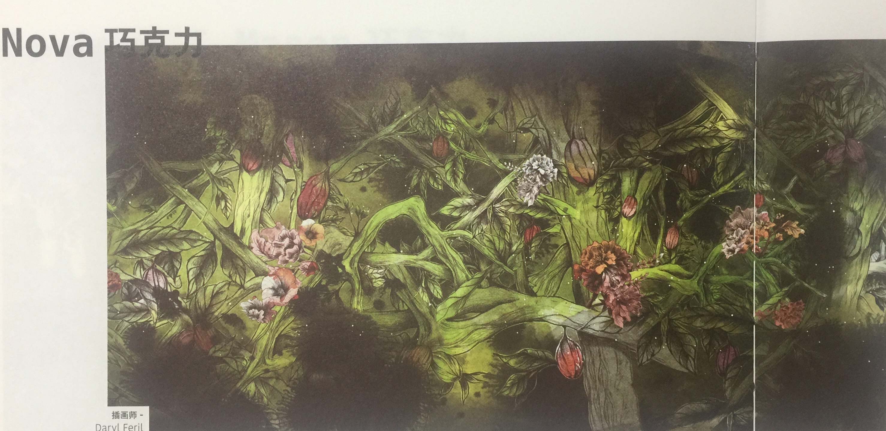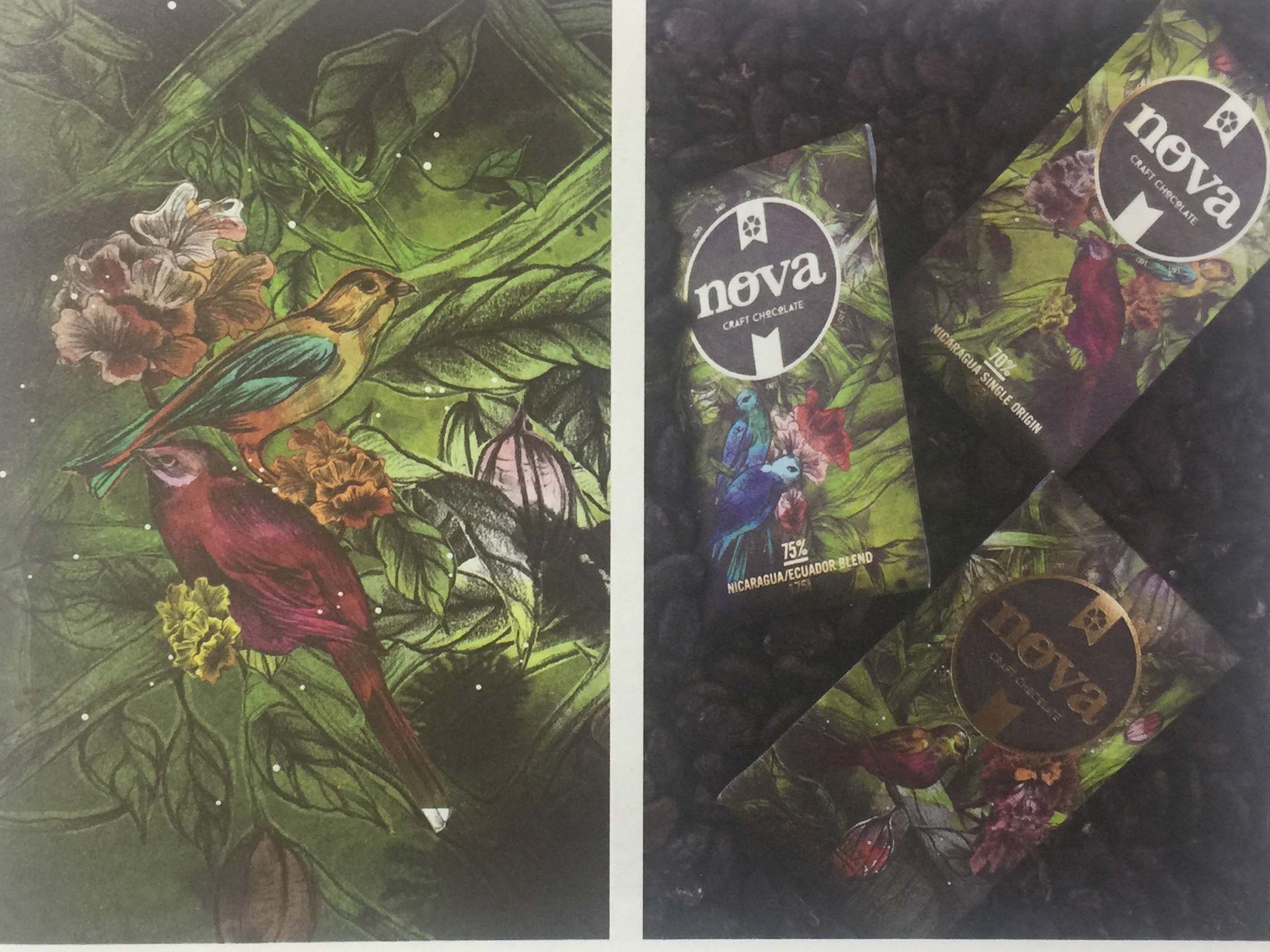 科羅拉多的Nova巧克力是以傳統(tǒng)工藝烘烤而成的特殊可可豆加工而成的。插畫師為此在這款巧克力的包裝上繪制了相互纏繞著的可可樹的圖案,以此展現(xiàn)它們牢固的根系。為了使插畫看起來有一種天然、綠色的感覺,插畫師對各個元素進(jìn)行了精心繪制和細(xì)致處理。雖然插畫經(jīng)過彩色數(shù)碼處理,但是插畫師還是希望在插畫中展現(xiàn)鉛筆筆畫的紋理。色彩繽紛的小鳥和花朵對可可豆產(chǎn)地的富饒環(huán)境進(jìn)行了描繪。每一幅創(chuàng)作都會給人帶來感官上的滿足,向人們呈現(xiàn)了巧克力產(chǎn)地的風(fēng)味及配料。