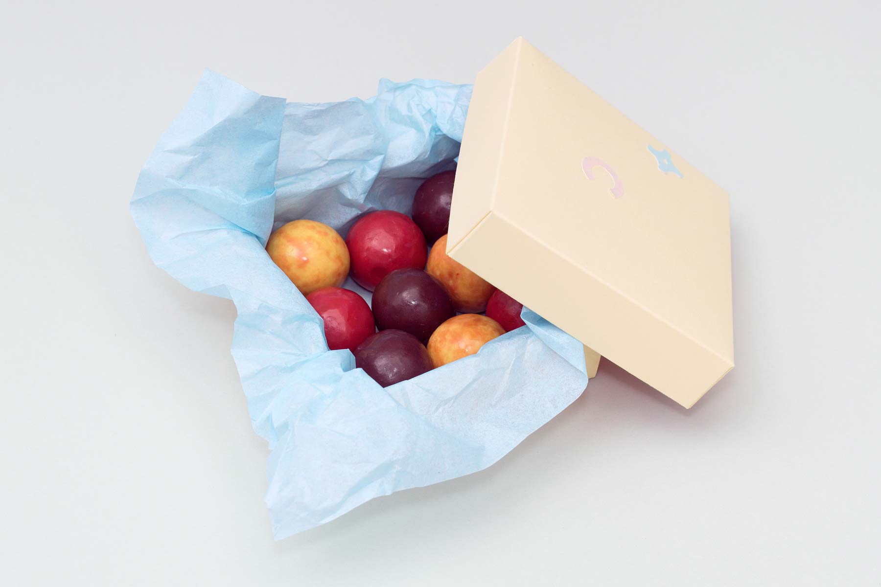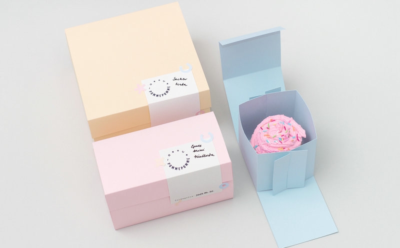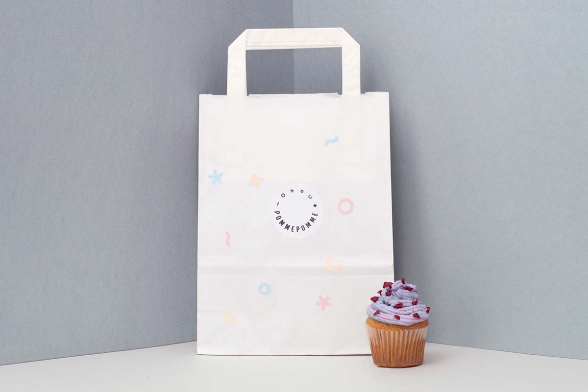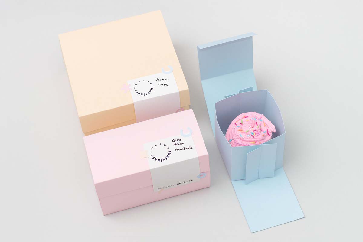 這家店的供應(yīng)范圍幾乎每天都在變化, 強(qiáng)烈強(qiáng)調(diào)季節(jié)性風(fēng)味, 因此設(shè)計(jì)和包裝也必須是靈活的。幾何形式指的是裝飾蛋糕和小貼紙是唯一放置在每個(gè)包裝上。