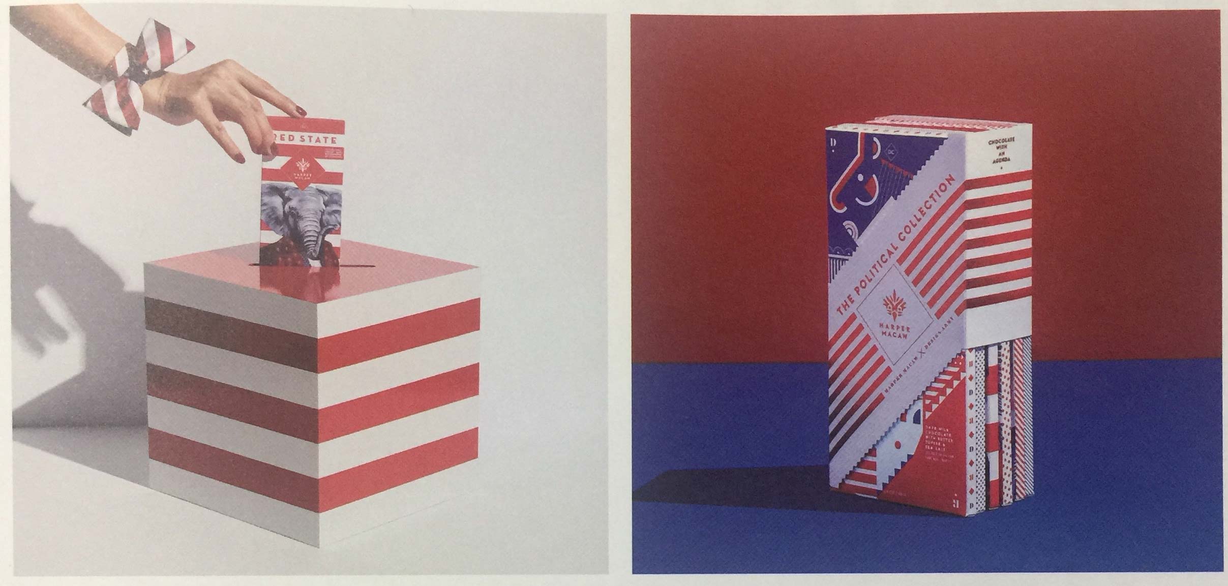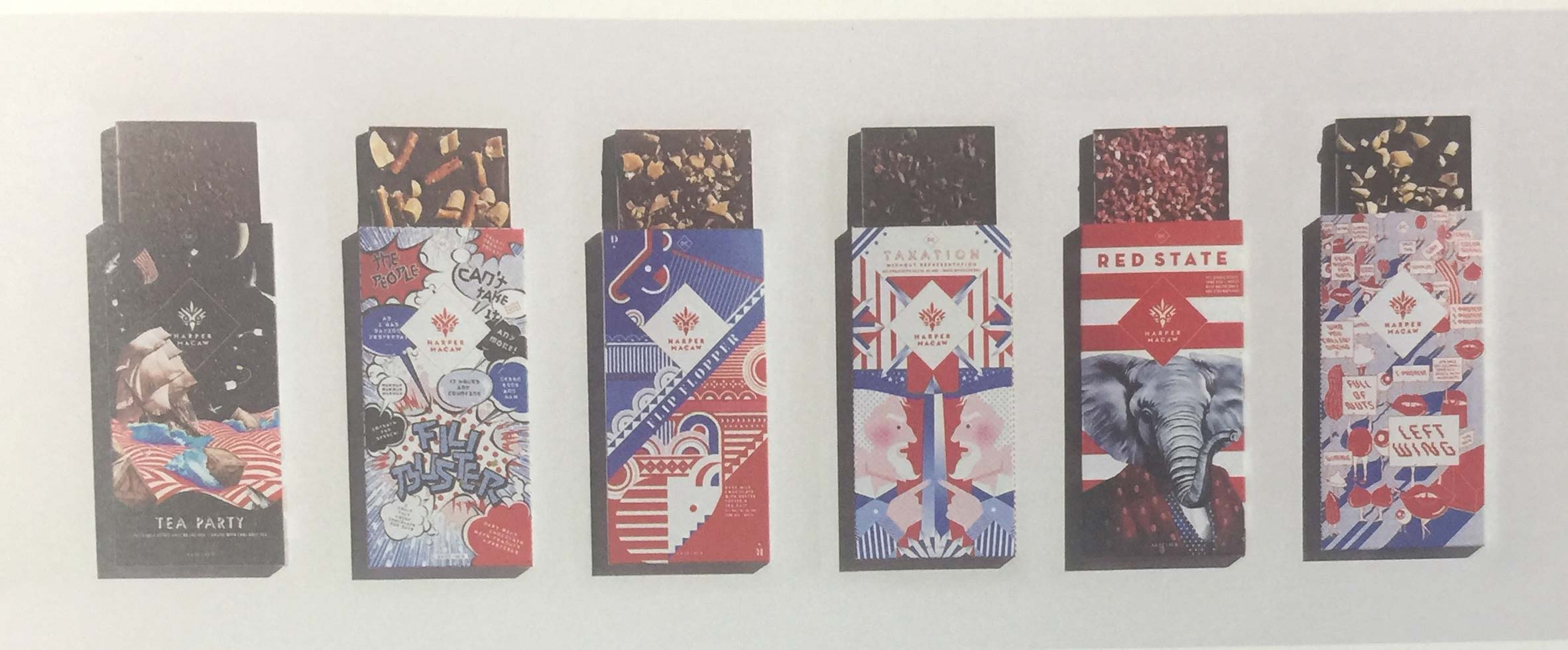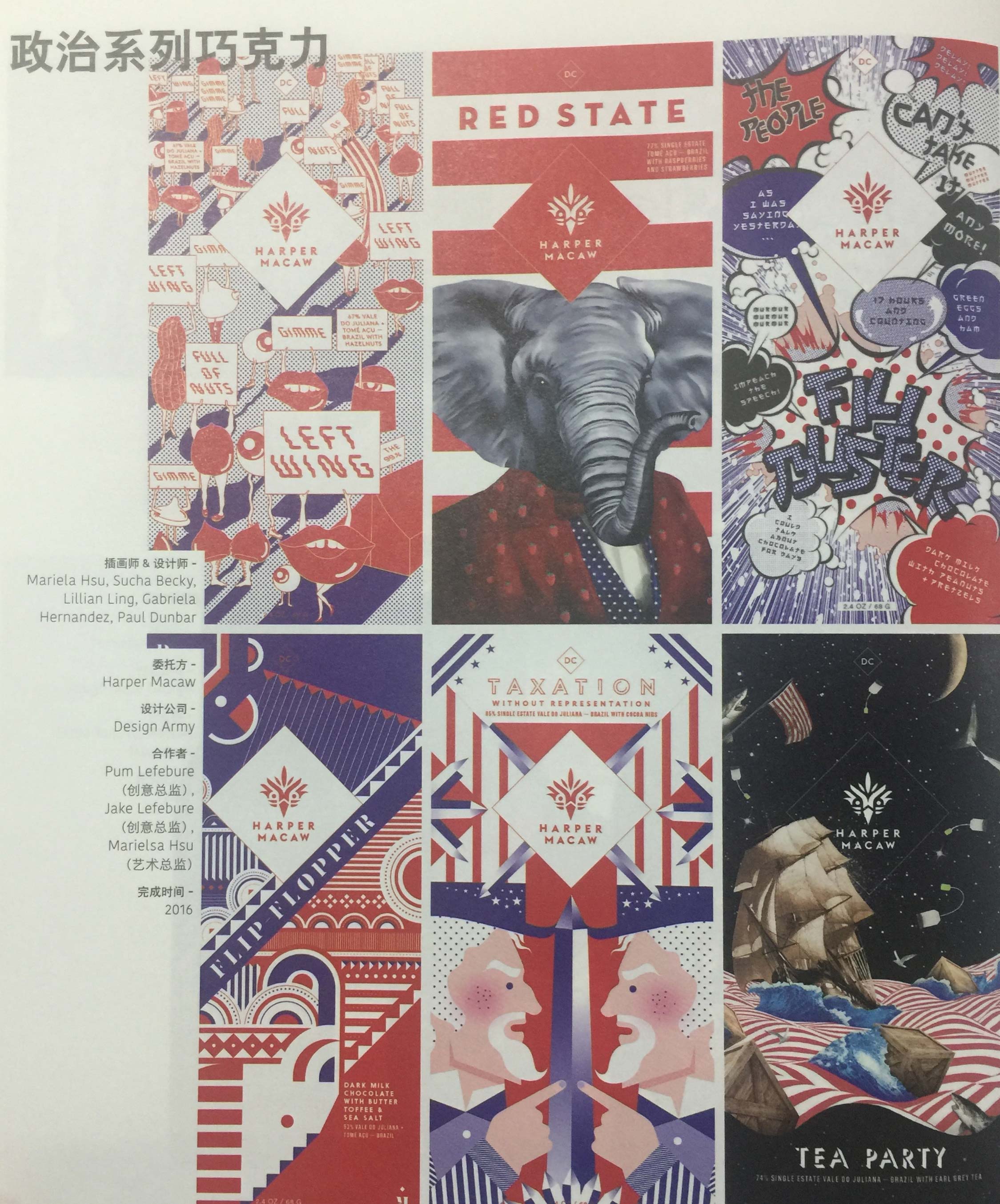 設(shè)計(jì)團(tuán)隊(duì)用手繪插畫、圖片拼貼畫和矢量圖形將新聞媒體融入到這款插畫包裝設(shè)計(jì)中。這些插畫是根據(jù)每款巧克力所反映的內(nèi)容設(shè)計(jì)而成的,而不是一整套巧克力包裝共用一幅同樣的插畫。比如,將圖案、色彩和矢量融合在一起的“左翼”插畫中的圖形與“紅色州”插畫中的圖形截然不同,后者更為整潔和形象。配以大膽圖形和定制插畫的紅、白、藍(lán)三色包裝具有一定的煽動性,在商店貨架上或網(wǎng)店內(nèi)制造了不小的輿論。