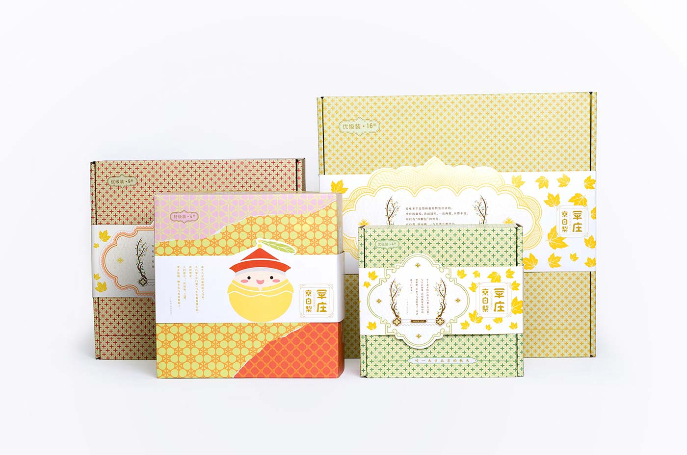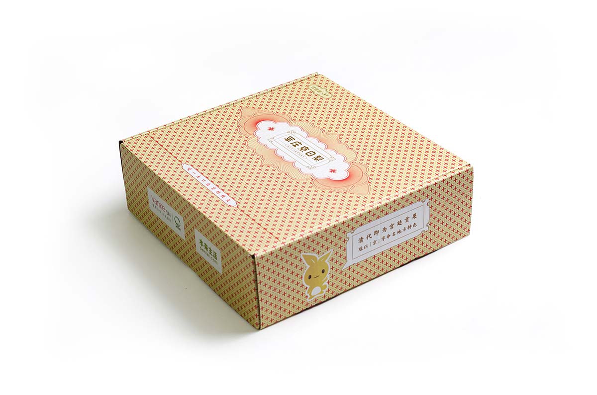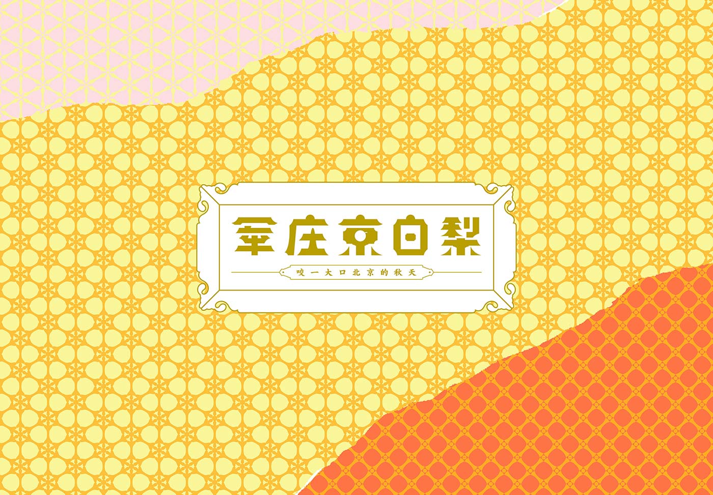 京白梨是很多老北京心心念念的美食,也出現(xiàn)在很多文人的筆墨里,在乾隆年間更成為貢梨。我們依據(jù)產(chǎn)品等級與克重一共設(shè)計了5款包裝, 分為貢品級和市井級,有4顆裝、9顆裝、16顆裝。貢品級有兩款包裝,取意貢品概念,借鑒皇家元素,設(shè)計了梨形皇帝和皇后吉祥物。其中一款設(shè)計元素取自故宮太和殿的窗花,三交六椀樣式,用拼貼手法完成產(chǎn)品的整體視覺。另一款包裝是要用于線下親子采摘活動,以“小皇帝坐在城頭吃梨”的詼諧插圖為主要表現(xiàn)手法完成。市斤級包裝主打老北京(北平)的的記憶,設(shè)計了以兔爺形象為靈感的吉祥物兔爺梨,包裝設(shè)計元素取自舊時的糧票紋樣,系列三款,各有特色
