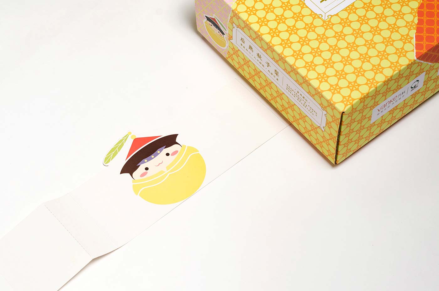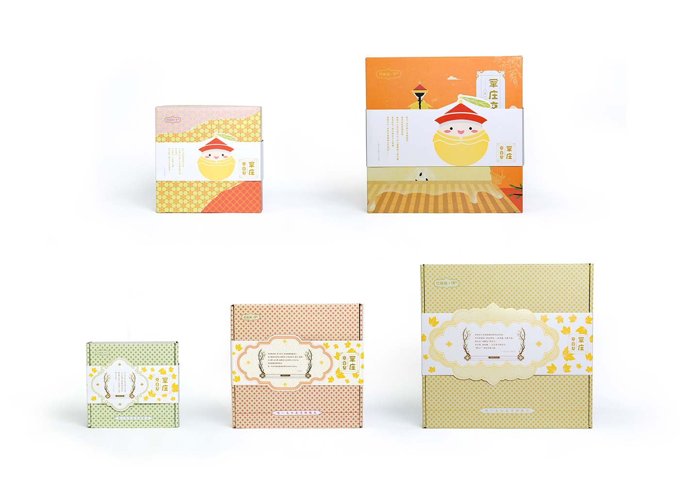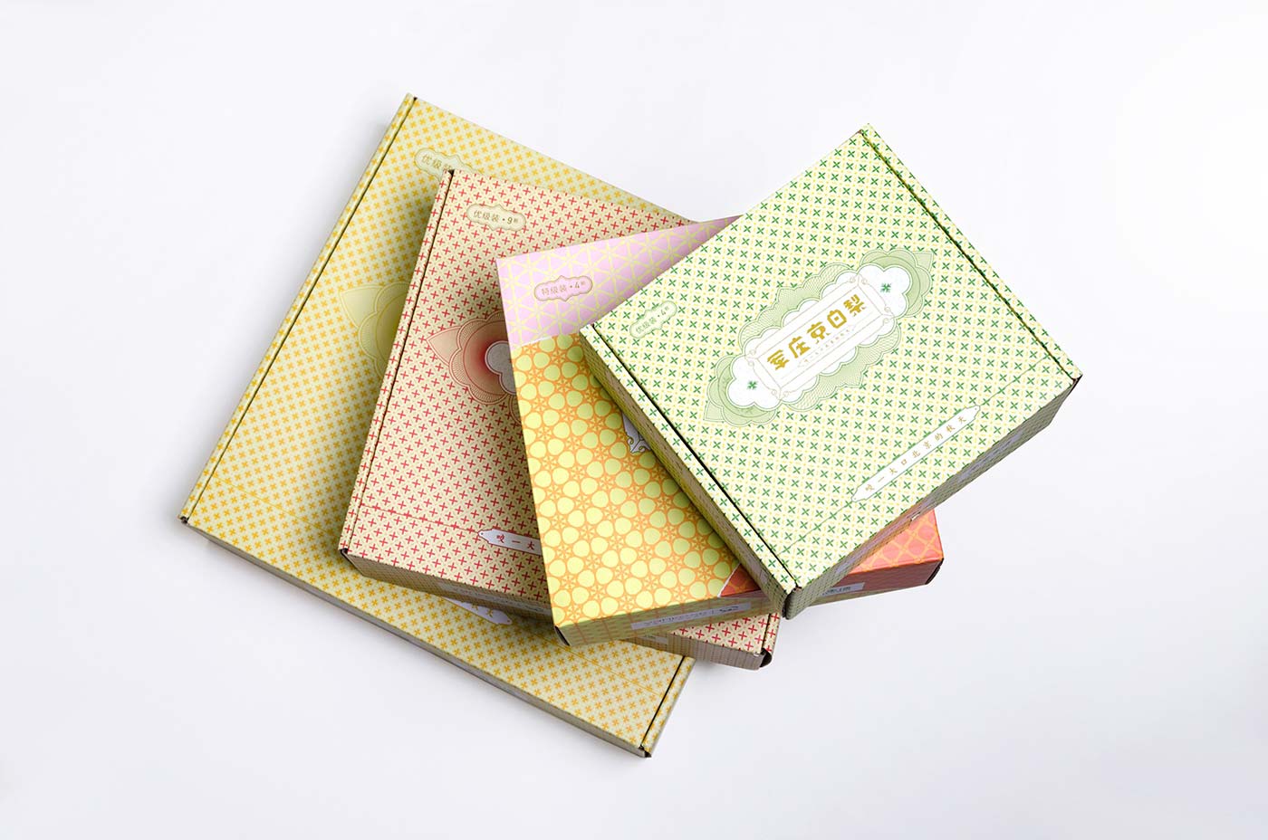 京白梨是很多老北京心心念念的美食,也出現(xiàn)在很多文人的筆墨里,在乾隆年間更成為貢梨。我們依據(jù)產(chǎn)品等級與克重一共設(shè)計了5款包裝, 分為貢品級和市井級,有4顆裝、9顆裝、16顆裝。貢品級有兩款包裝,取意貢品概念,借鑒皇家元素,設(shè)計了梨形皇帝和皇后吉祥物。其中一款設(shè)計元素取自故宮太和殿的窗花,三交六椀樣式,用拼貼手法完成產(chǎn)品的整體視覺。另一款包裝是要用于線下親子采摘活動,以“小皇帝坐在城頭吃梨”的詼諧插圖為主要表現(xiàn)手法完成。市斤級包裝主打老北京(北平)的的記憶,設(shè)計了以兔爺形象為靈感的吉祥物兔爺梨,包裝設(shè)計元素取自舊時的糧票紋樣,系列三款,各有特色