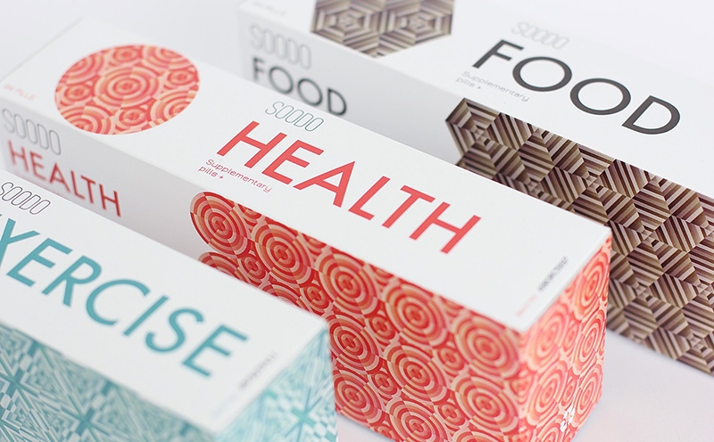 品牌名稱“SOODO”是通過將原始詞“偽”的發(fā)音,即不假的,有誤導(dǎo)性的。消除創(chuàng)造健康生活的所有自然方式的想法,導(dǎo)致失去與這些活動相關(guān)的重要的社會互動。我想要設(shè)計方法來反映這樣一個悲劇的后果。產(chǎn)品包裝采用幾何圖形進行設(shè)計,用漸變的方法使圖案更抽象化,表達補藥對人體產(chǎn)生的微妙變化。