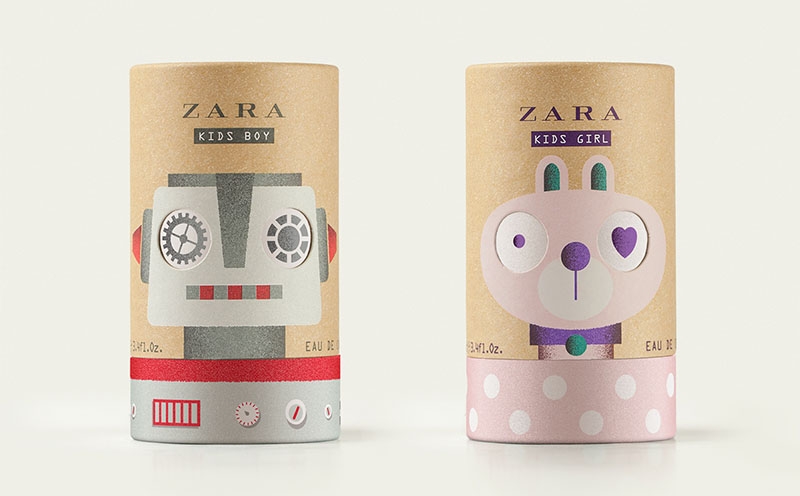 ZARA KIDS是3至14歲兒童的香水。我們被要求為香水的包裝提供兩個(gè)有趣和有吸引力的插圖和角色,與孩子進(jìn)行視覺語言交談,并且還明確區(qū)分男孩和女孩。 我們創(chuàng)建了一個(gè)兔子和一個(gè)機(jī)器人的插畫,用精心挑選的色彩搭配來滿足包裝設(shè)計(jì)要求。除此之外,我們特別感興趣的是給包裝上的人物一個(gè)俏皮的表情變換,而不僅僅是被打開的保護(hù)套。我們想到,通過使用紙板管,旋轉(zhuǎn)蓋子,使每個(gè)角色的眼睛轉(zhuǎn)動(dòng)一次,表情就變換一次,足夠吸引兒童的注意力。有一點(diǎn)注意的是,蓋子的位置不固定在管子的底部,這意味著每個(gè)參考線在銷售點(diǎn)不同。
