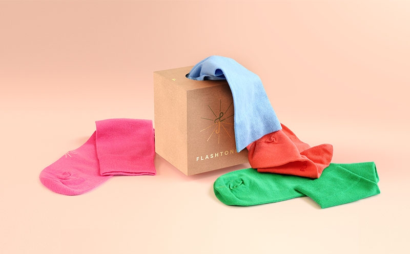 捷克襪子品牌FLASHTONES就是今天的主角,它最大的特色就是襪子五顏六色,充滿時尚感。設(shè)計師在設(shè)計產(chǎn)品包裝時想到了抽紙,他們利用回收后的硬紙板制作了方形盒子,正上方的大圓露出了襪子的顏色,也有襯托和表現(xiàn)顏色的作用,還可以像抽紙一樣把襪子抽出來。