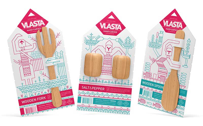 這是一個(gè)廚具品牌,品牌名稱來(lái)自古代女性名字,其字面意思是“力量”。根據(jù)維基百科,俄羅斯婦女承擔(dān)了工作和家庭責(zé)任的“雙重負(fù)擔(dān)”,丈夫通常參與不多。所以,我們以女性作為這次包裝的視覺主體,結(jié)合產(chǎn)品,通過刺繡和插畫兩種藝術(shù)形式講述關(guān)于一個(gè)女人和她的日常生活的故事——提水、翻地、摘水果。