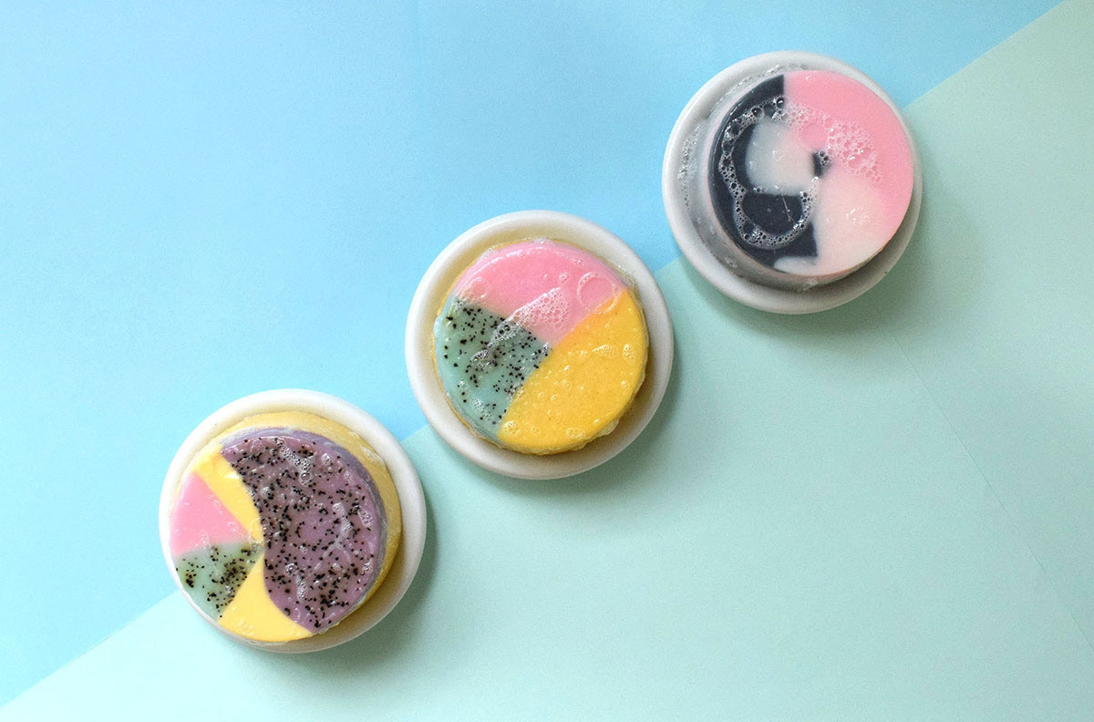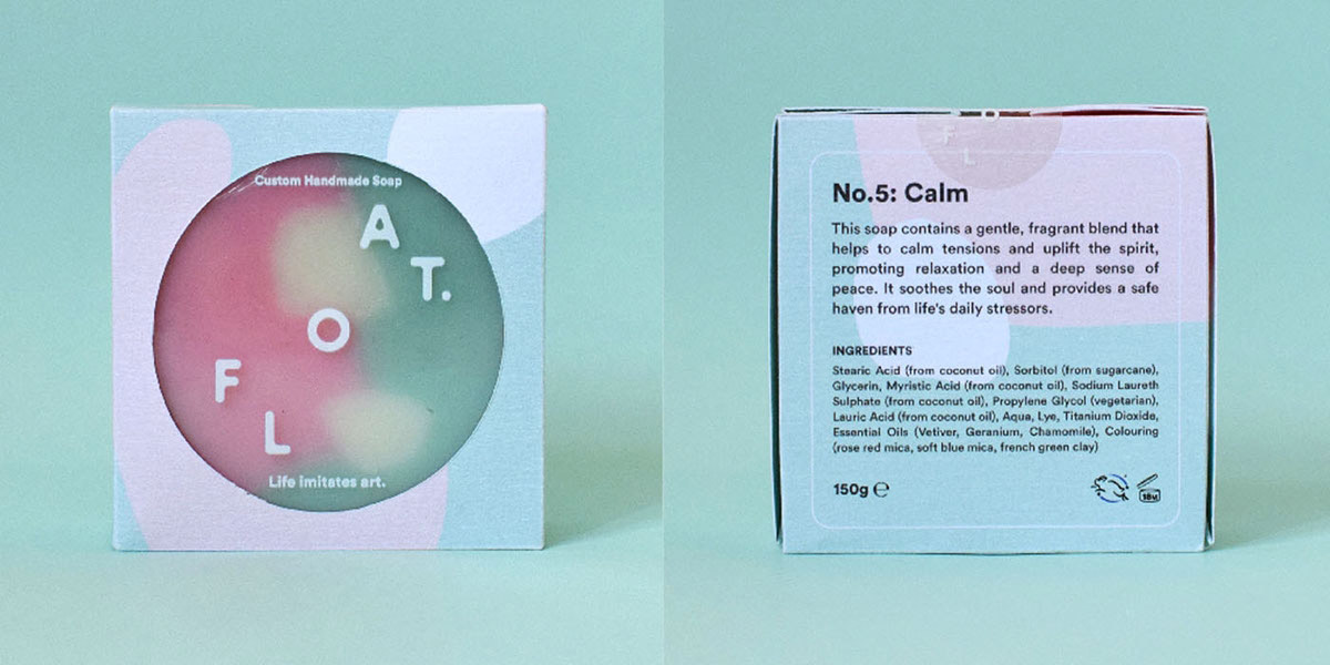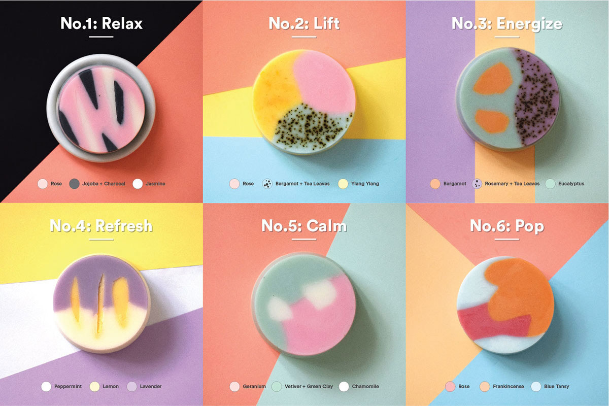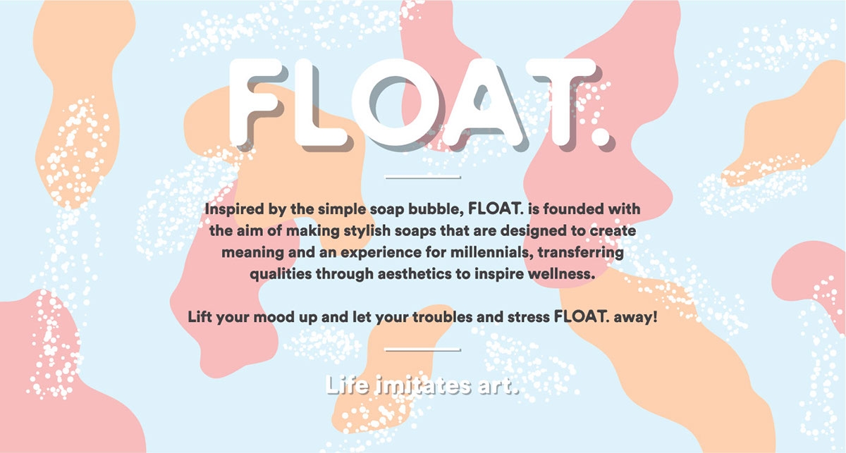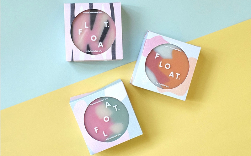 “視這些香皂為藝術(shù)”,是FLOAT的視覺語言的指導(dǎo)原則。 靈感來自于肥皂泡的顏色,形式和活力,這些品質(zhì)被翻譯成油漆般的圖形,反過來表現(xiàn)為抽象的藝術(shù)作品,適應(yīng)不同的浴室內(nèi)飾。這些圖案的靈感來自于氣泡形成,通過添加常見的天然粉末和去角質(zhì)劑改變肥皂的紋理,以及與油漆如中風(fēng)和斑點(diǎn)相關(guān)的動(dòng)作。
