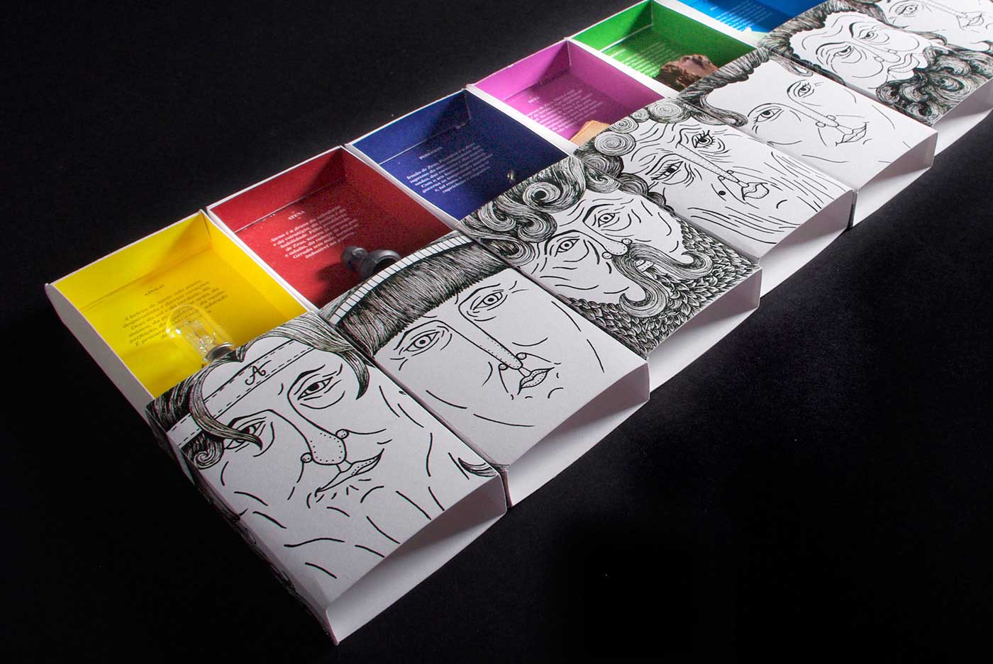 設計師把奧林匹斯的十二諸神(宙斯、赫拉、波塞冬、阿波羅 阿佛洛狄忒,阿耳忒彌斯,愛馬仕,得墨忒耳,雅典娜,阿瑞斯,從狄俄尼索斯和赫淮斯托斯),在外部的包裝盒上通過手繪把他的個性“頭”表現(xiàn)出來。