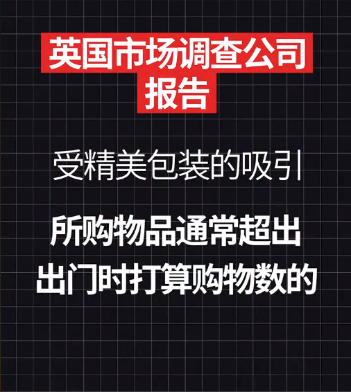 同時(shí)英國(guó)市場(chǎng)調(diào)查公司報(bào)告,一般上超級(jí)市場(chǎng)購(gòu)物的婦女,由于受精美包裝的吸引,所購(gòu)物品通常超出進(jìn)門(mén)時(shí)打算購(gòu)物數(shù)的45%。