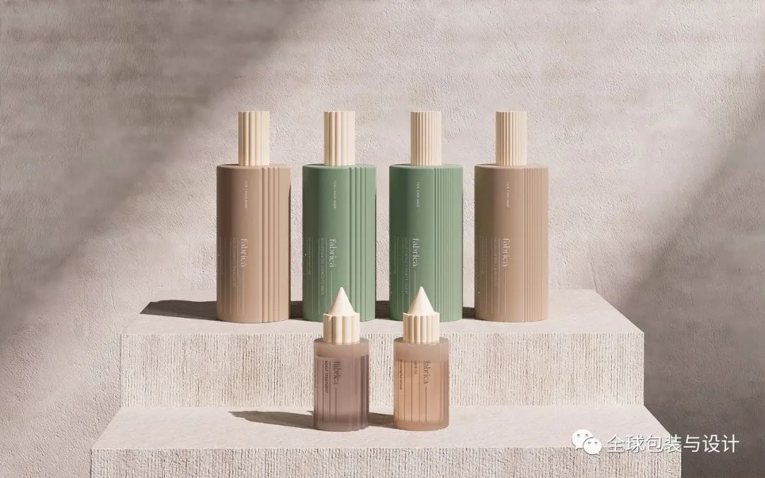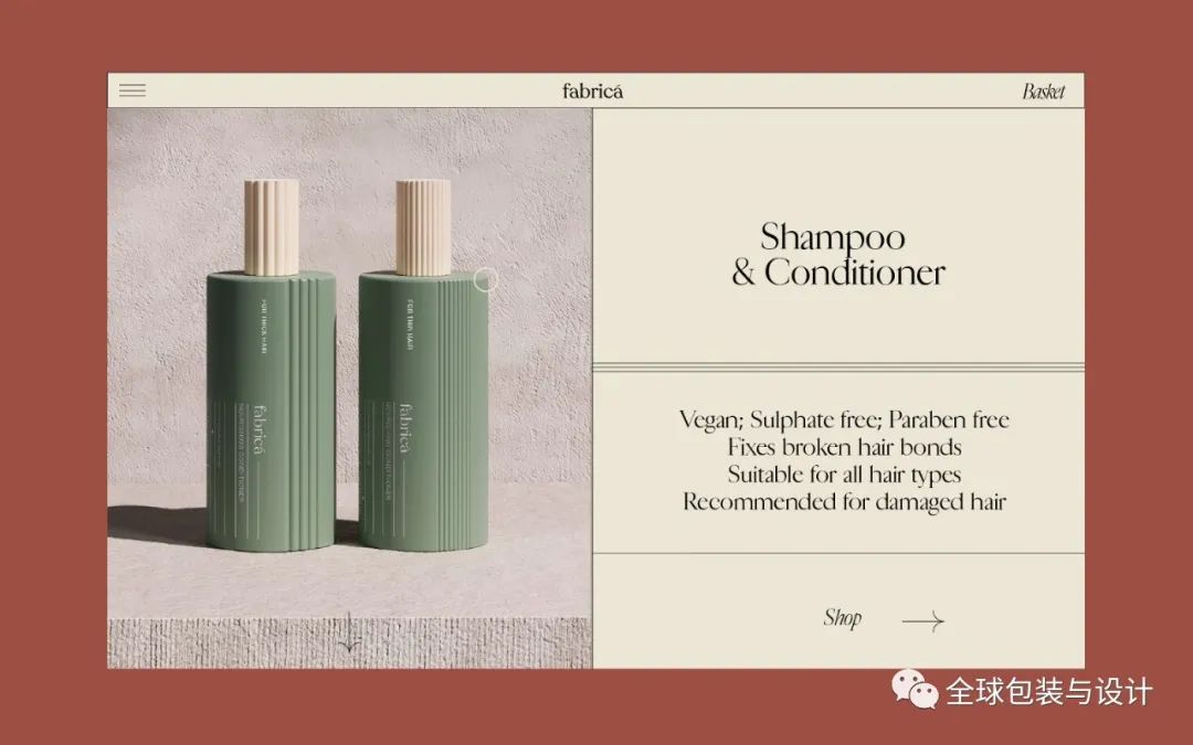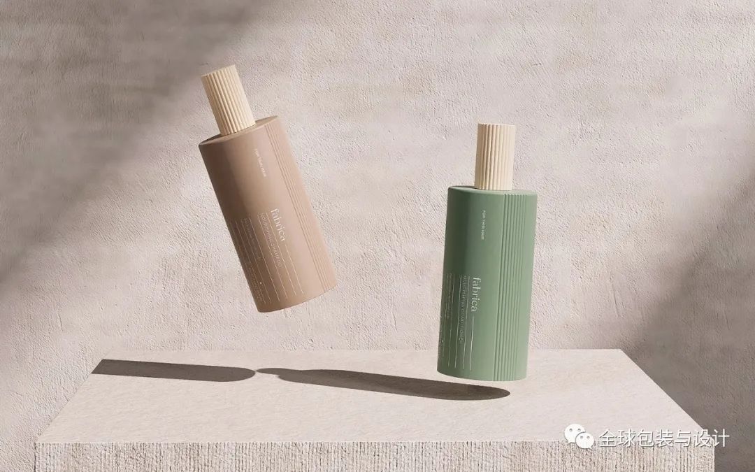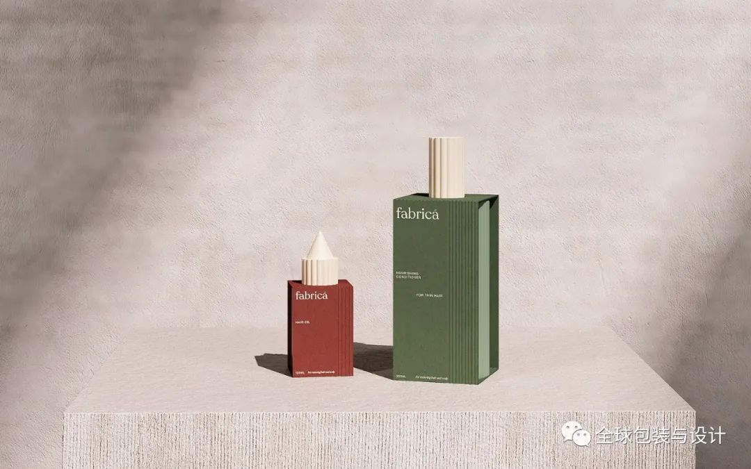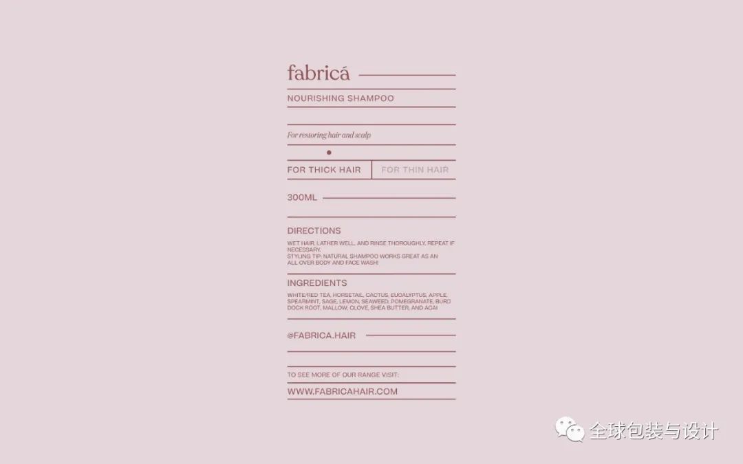 fabricá——一種專門(mén)針對(duì)濃密和稀疏頭發(fā)的新護(hù)發(fā)理念。頭發(fā)類型反映在瓶子本身上,要么是粗線,要么是細(xì)線。土色調(diào)用于表示產(chǎn)品類型,無(wú)論是深橄欖型洗發(fā)水還是砂質(zhì)洗發(fā)水。這個(gè)名字來(lái)源于紋理的拉丁文翻譯。