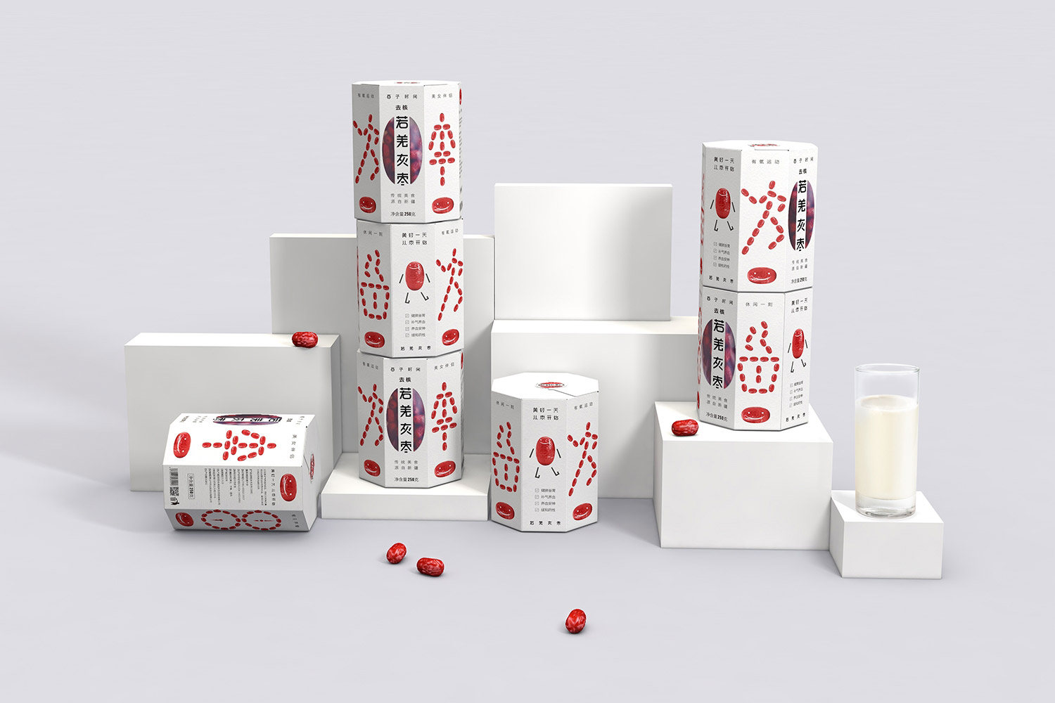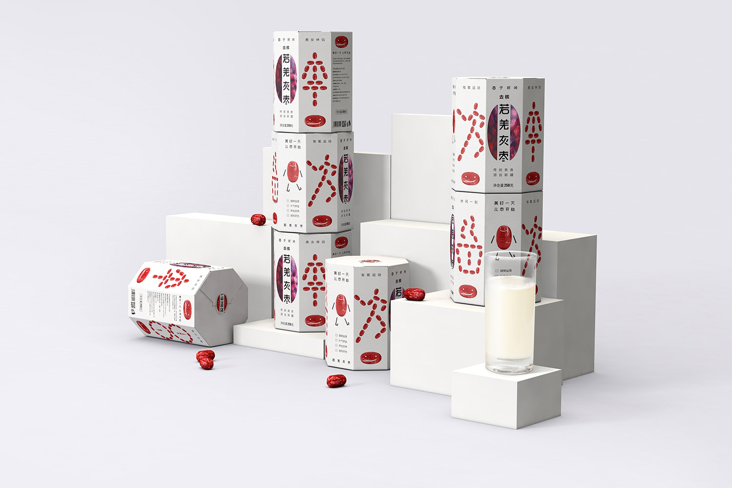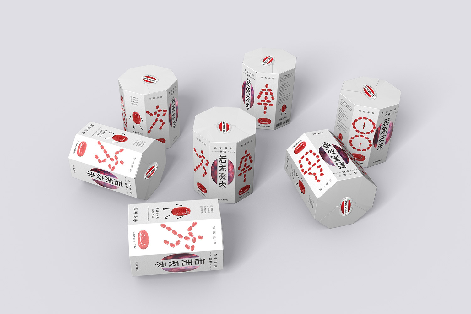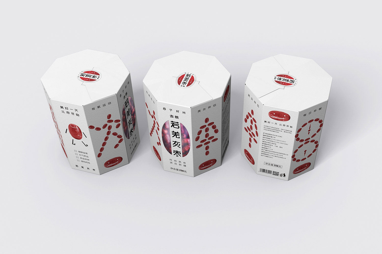 8棱柱形的紙盒與防潮食品袋結(jié)合,打破常規(guī)紅棗包材,提高了包裝的展示效果,同時紙材輕盈,方便包裝封裝和運輸。