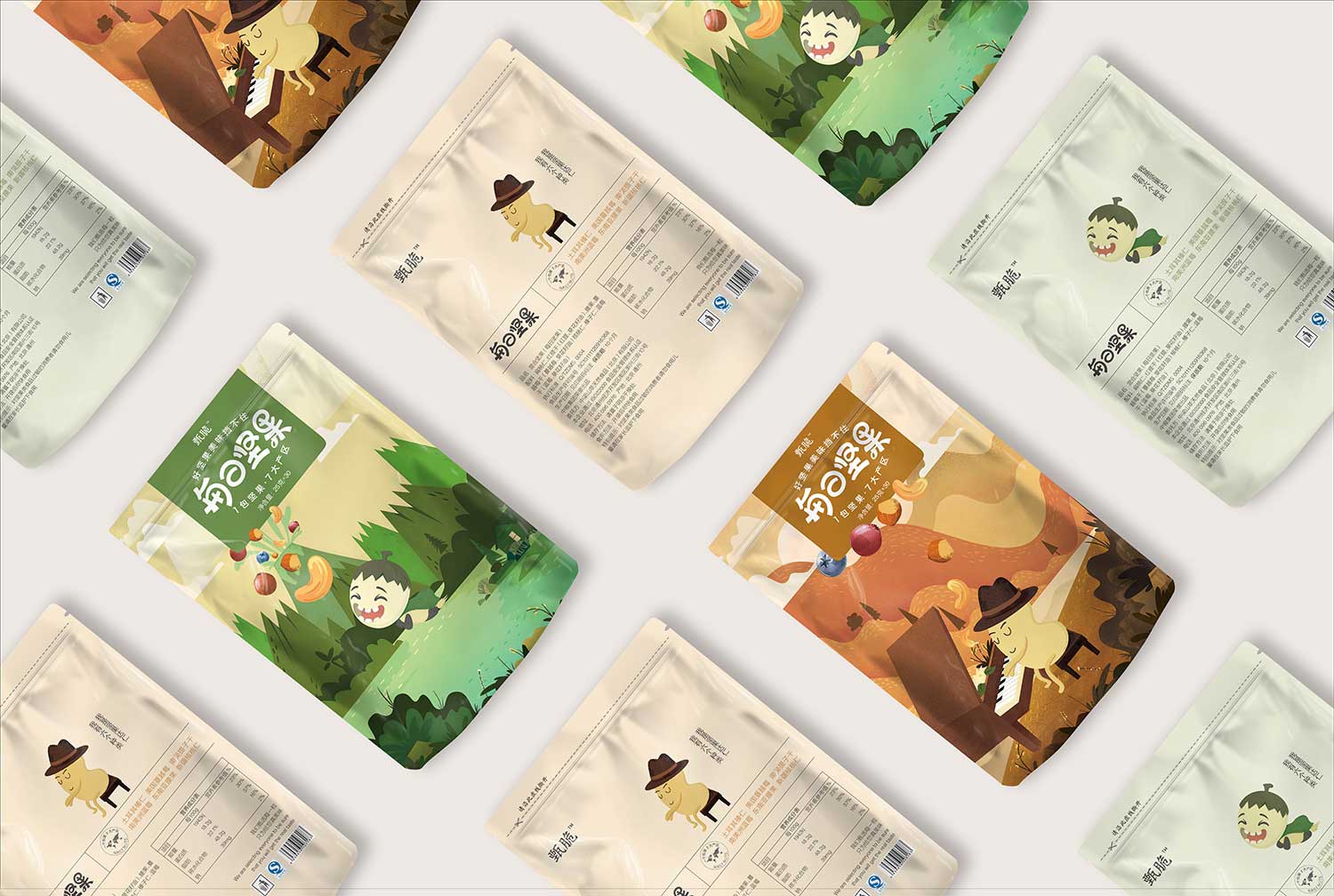 為了契合好甄脆的產(chǎn)品理念,我們先分析堅果的生長環(huán)境,市場的消費人群與消費對象的深度挖掘,對其顏色字體還有對新事物的接受程度做出分析.在字體選擇上選擇了,易于閱讀的和傳達性的黑體,對其進行了優(yōu)化,在品名字體設計中做了圓化處理,給人活潑可愛親和力的感覺,文字中的細節(jié)在閱讀上較慢,但可以做到慢記不忘,不同于快記快忘得沒細節(jié)的字體,在插畫選擇上使用扁平化處理,加入一些質(zhì)感,提升品牌的精細度,傳達出甄選的意思,針對男女和消費人群做出了不同的顏色選擇和藝術處理.在傳達企業(yè)文化同時也幫消費者提供了良好的選擇,我們多一點,讓消費者少一點抉擇多一點美好體驗.