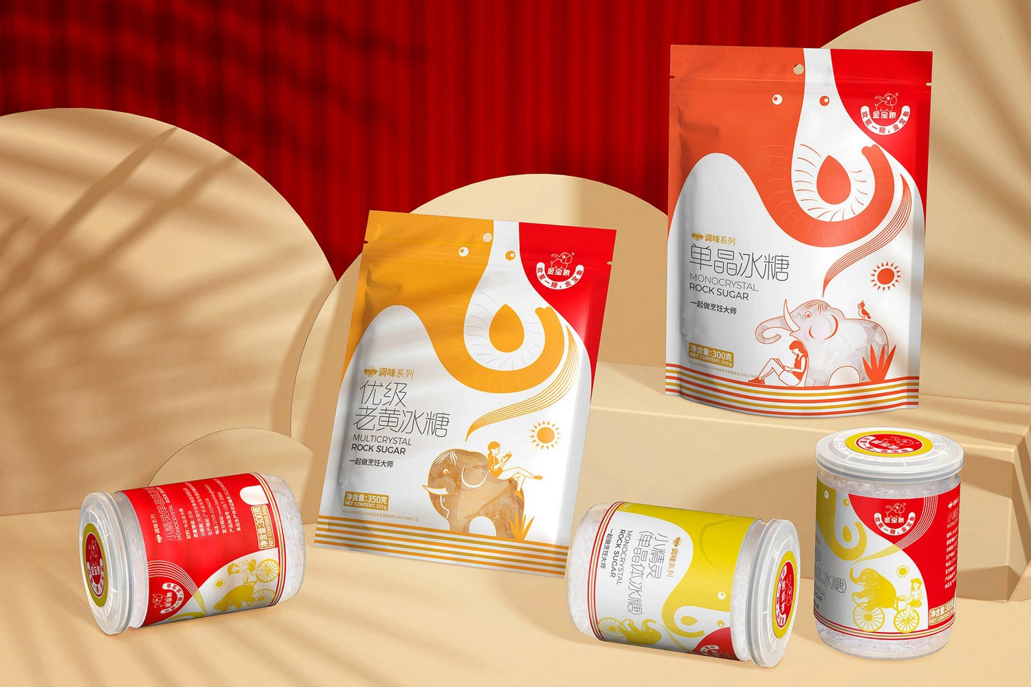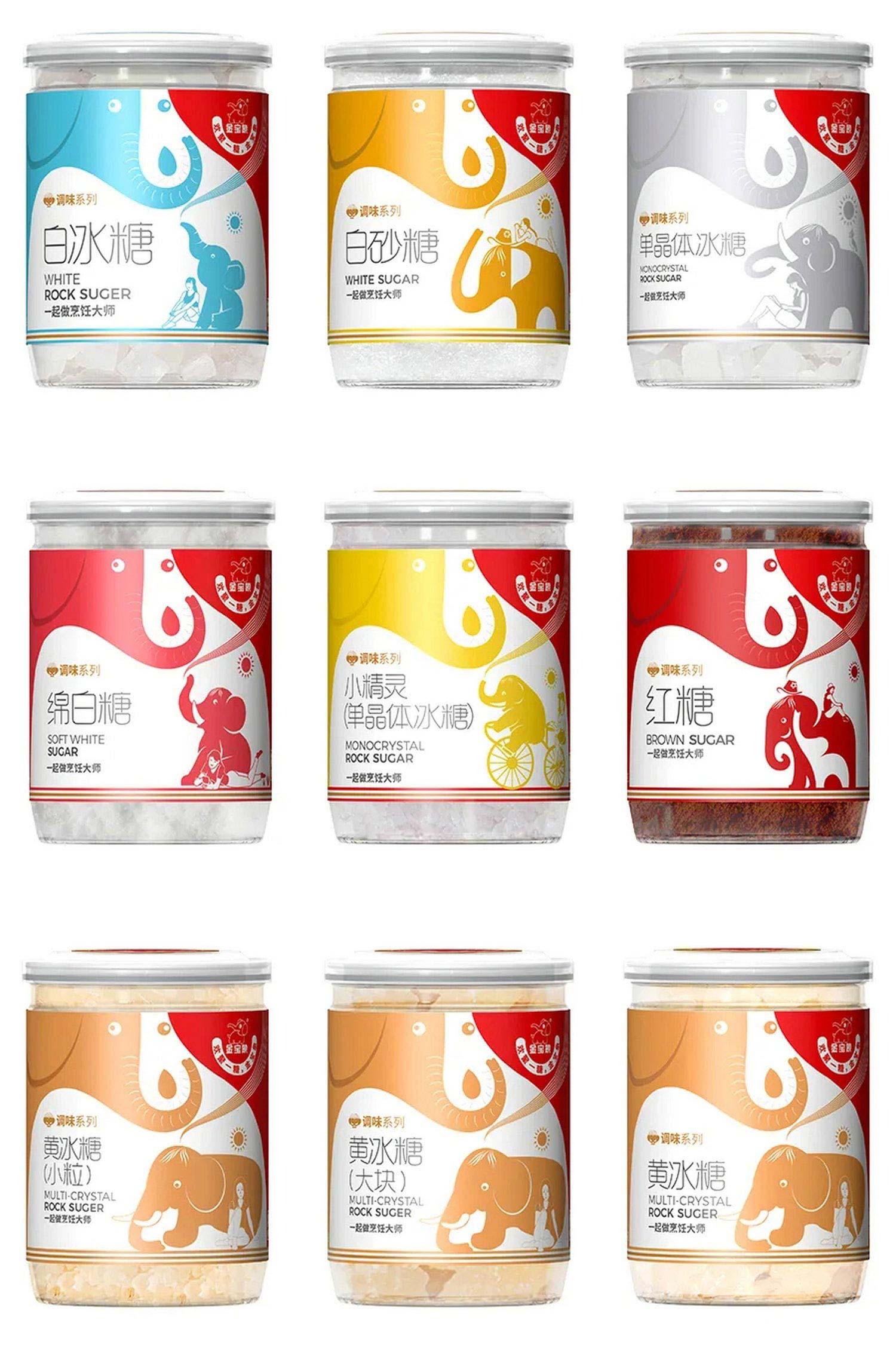 包裝頂部采用正負形的創(chuàng)意設計手法,巧妙組合構成了3個大象形象,以此強化包裝的第一識別特征;下半部分根據不同的糖制品,對大象及場景進行設計延展,并搭配不同暖色調顏色,底部輔以彩色條紋,再一次突出品牌的識別符號-大象,而大象采用透明處理,直觀展現(xiàn)產品,以此強化品牌包裝的識別記憶點,實現(xiàn)不同產品的系列區(qū)分。最終實現(xiàn)品牌名,廣告語,品牌故事,產品包裝多位一體的品牌傳達體系。