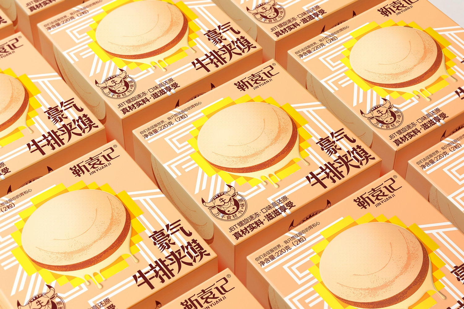 產(chǎn)品名稱的關(guān)鍵詞“豪氣”設(shè)計(jì)成圖形化的線條字體;肉夾饃則采用插畫(huà)風(fēng)來(lái)表現(xiàn),并結(jié)合像素化的輻射狀花朵,將其符號(hào)化,通過(guò)這一符號(hào)強(qiáng)調(diào)美味如花綻放的視覺(jué)感受,顛覆傳統(tǒng)肉夾饃包裝的表達(dá)風(fēng)格。
