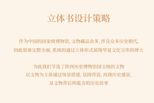 此次與厚啟設(shè)計合作,為通過立體書的形式再現(xiàn)歷史文化盛景,將華夏文化寶庫系統(tǒng)的展現(xiàn),將文物更加細(xì)致的呈現(xiàn)在大家眼前,將文物背后蘊含的故事娓娓道來。厚啟設(shè)計團隊?wèi)阎鴮v史文化的敬畏之心與對藝術(shù)設(shè)計的匠人精神開啟了陜西歷史博物館文創(chuàng)產(chǎn)品-立體書的設(shè)計之行。