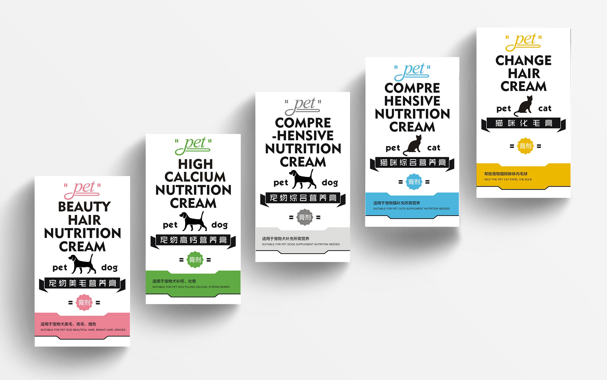 由于寵物的體形大小,飲食習(xí)性,機(jī)體代謝不完全一樣,因此對(duì)于營(yíng)養(yǎng)品的需求也是不同的,營(yíng)養(yǎng)粉,營(yíng)養(yǎng)片,營(yíng)養(yǎng)膏,三種不同形態(tài)的包裝,以及每款產(chǎn)品下的系列包裝,共有15款包裝,通過(guò)和客戶的溝通,最終確定以系列化包裝展開設(shè)計(jì)。