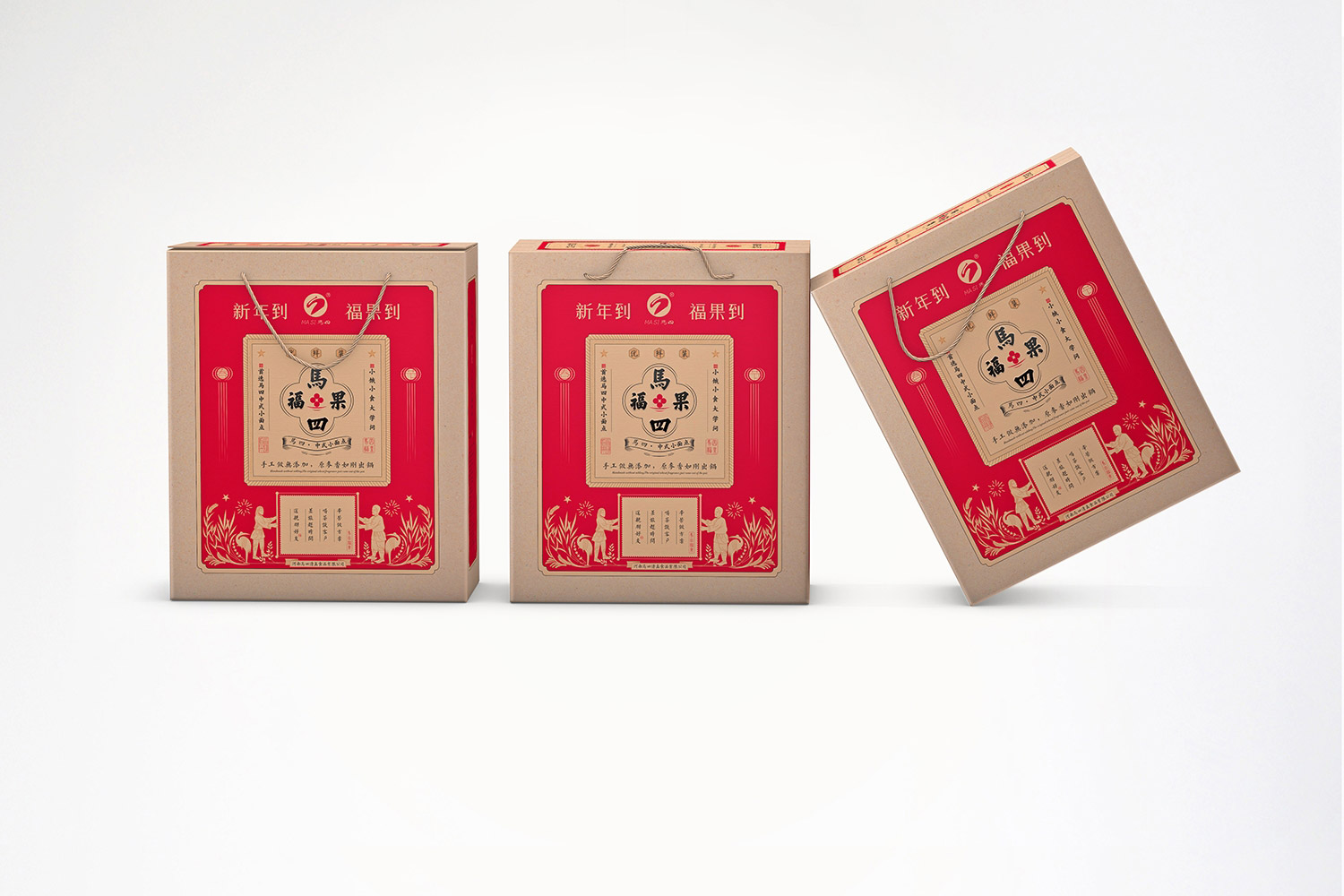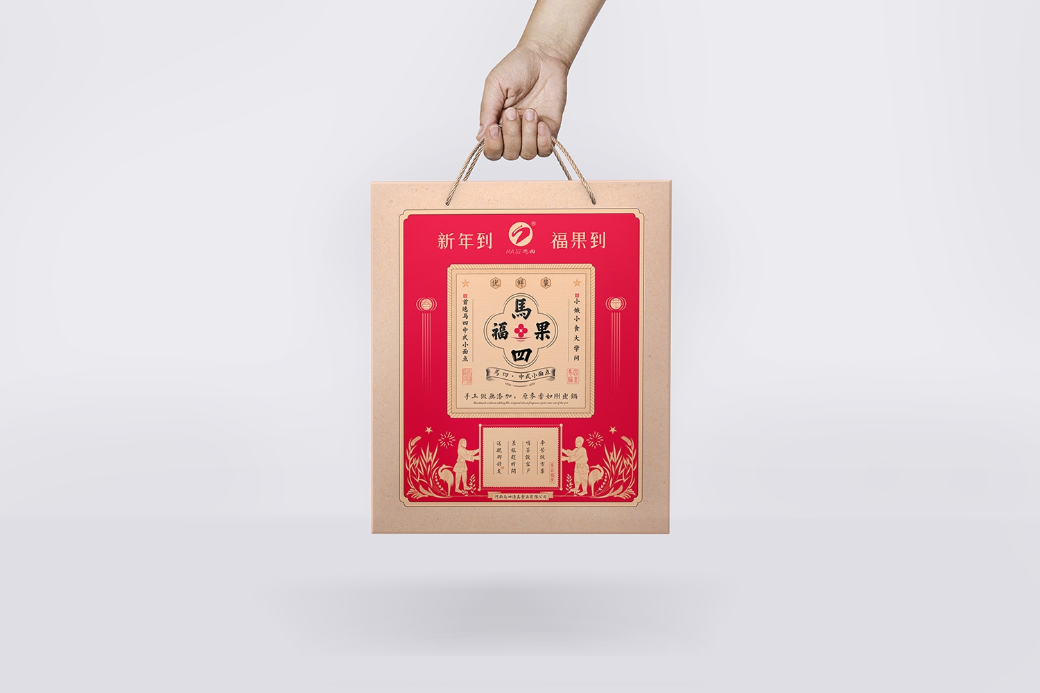 春節(jié)款節(jié)日禮包的設(shè)計(jì),需要營造出傳統(tǒng)節(jié)日的喜慶氛圍,同時(shí),能強(qiáng)化馬四福果的品牌形象;