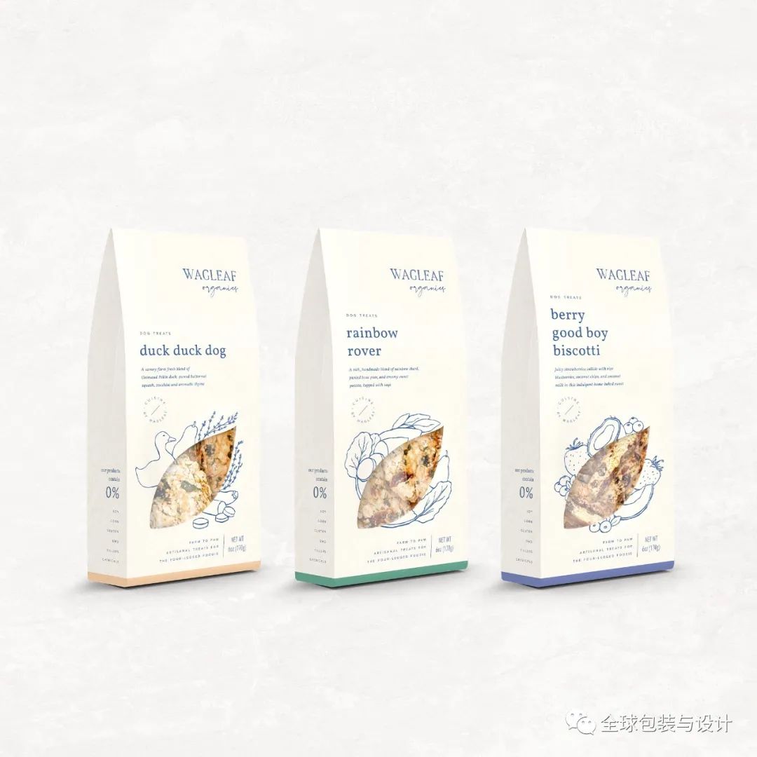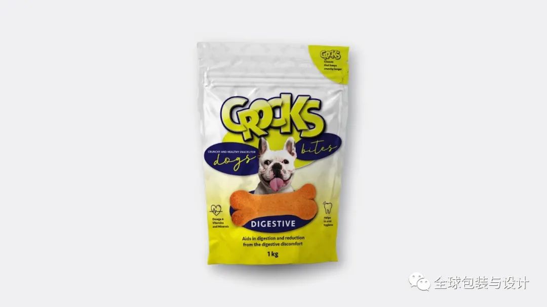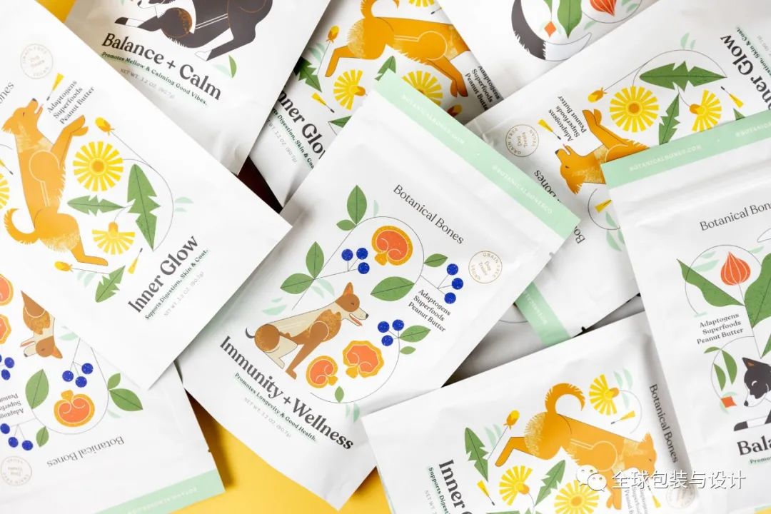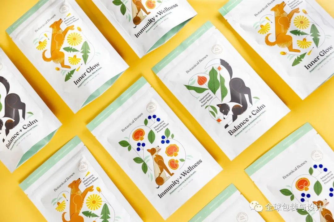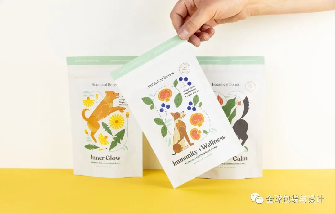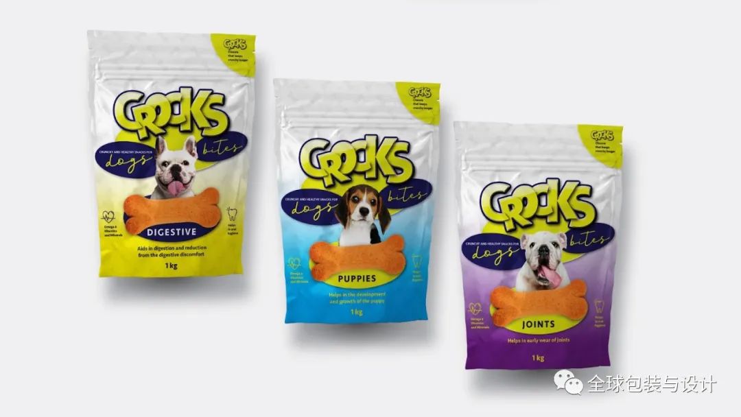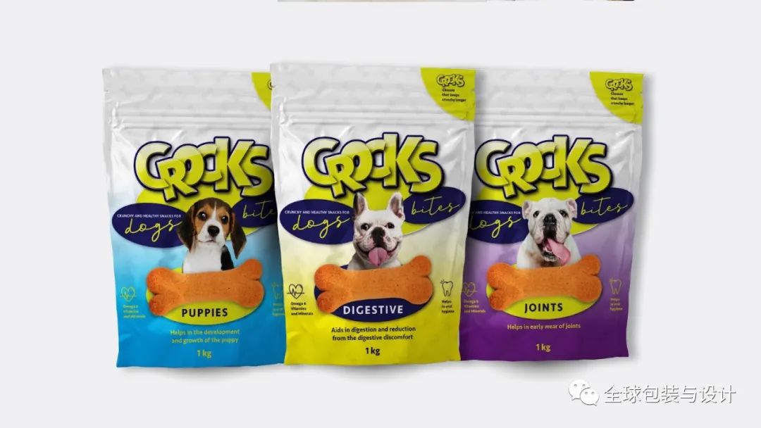 寵物產(chǎn)品的品牌給人溫暖、友好的感覺,并賦予每個(gè)袋子上描繪的狗許多反映零食成分性質(zhì)的特征。