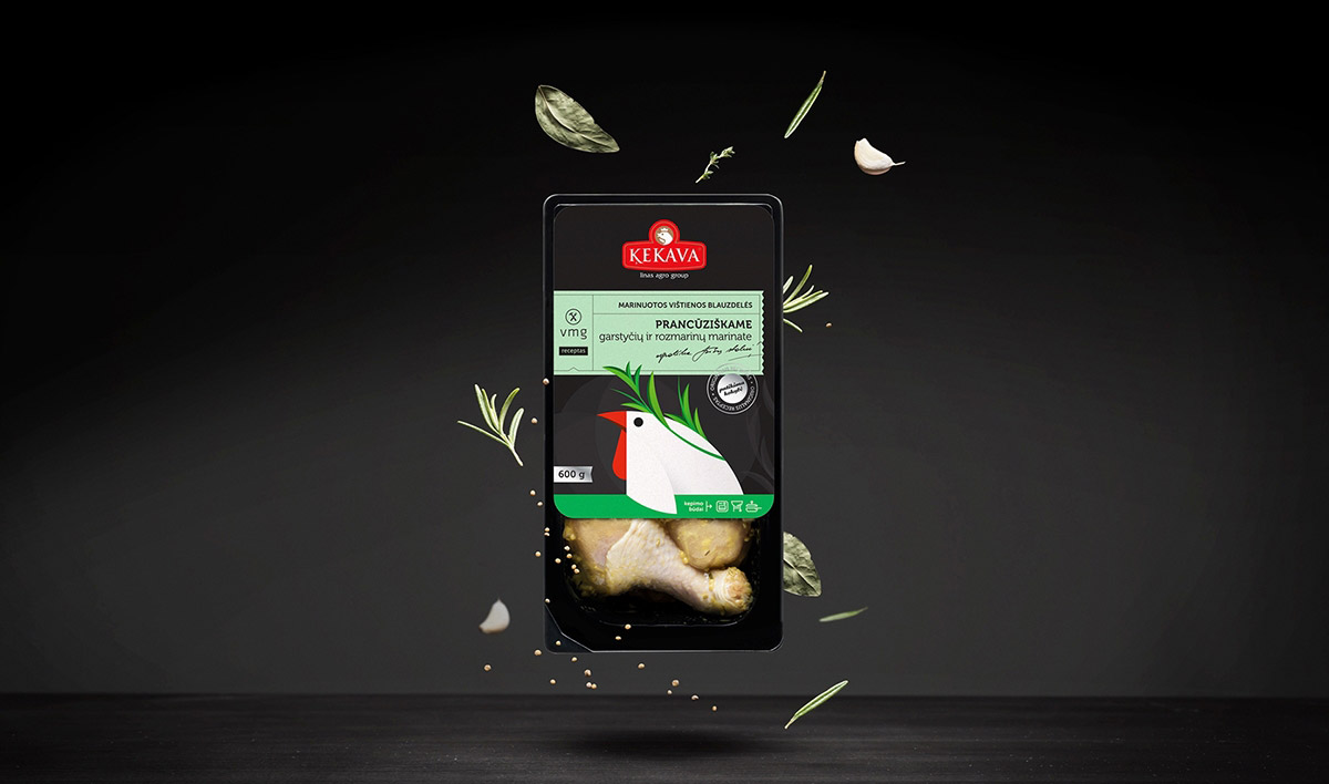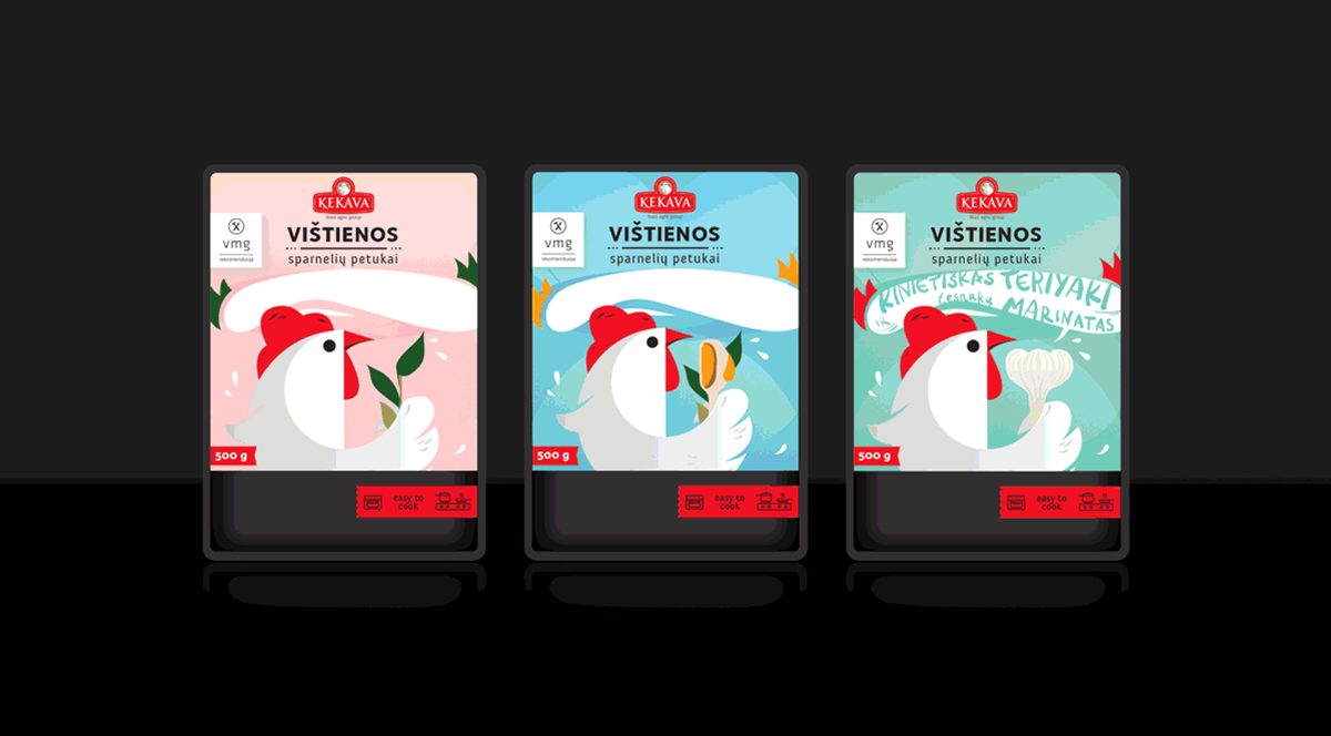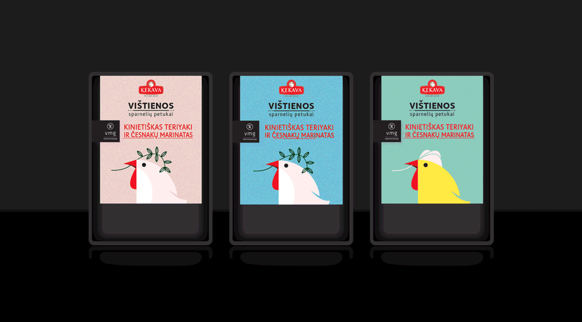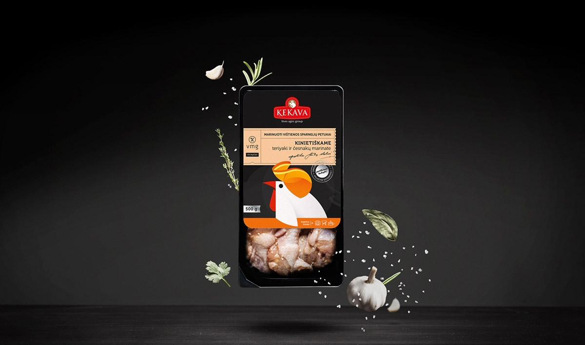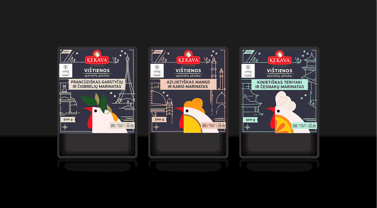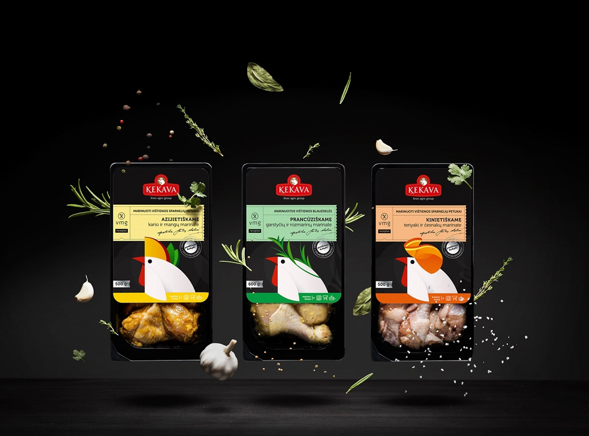 “Kekava and VMG”是一家家禽公司新的產品,它有非常高的產品質量標準,使其在市場上占領安全食品品類的第一。“Putnu Fabrika Kekava“公司有雄心領導波羅的海周邊國家的食品業(yè)務,這就是為什么當他們把鹵制產品引進立陶宛的市場的時候,必須制作出引領潮流的食物。健康的雞肉結合VMG的食譜,同樣也需要精美潮流的包裝設計。在產品的生產中,雞肉和腌制過的原料是非常健康的,用卡通插圖和生動的顏色,區(qū)別于其他禽類產品,每一個包裝上卡通雞都代表不同配方,包裝上都有腌料的主要成分--芒果、迭迭香、橙子。用這些產品的設計元素來設計整個雞肉包裝,讓產品顯得更加的新鮮。