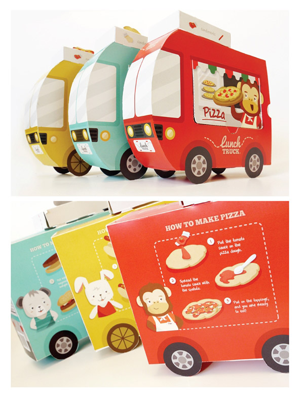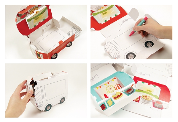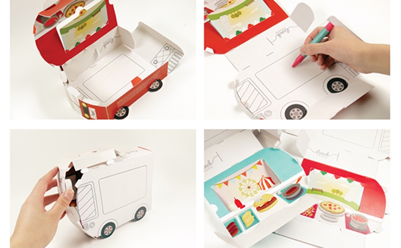 早晨給孩子打包午餐會非常忙碌,尤其是當(dāng)孩子挑食的時候,而午餐卡車能夠讓孩子快速獲得美味和健康的午餐。該食物卡車的包裝結(jié)構(gòu)設(shè)計表達(dá)了一個有趣的想法——食物在旅途中流動