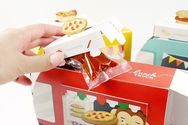 午餐車有三種不同的品種:熱狗、迷你漢堡和比薩餅,配料被分開放置,為孩子們提供了創(chuàng)造性地組裝自己午餐的機(jī)會。